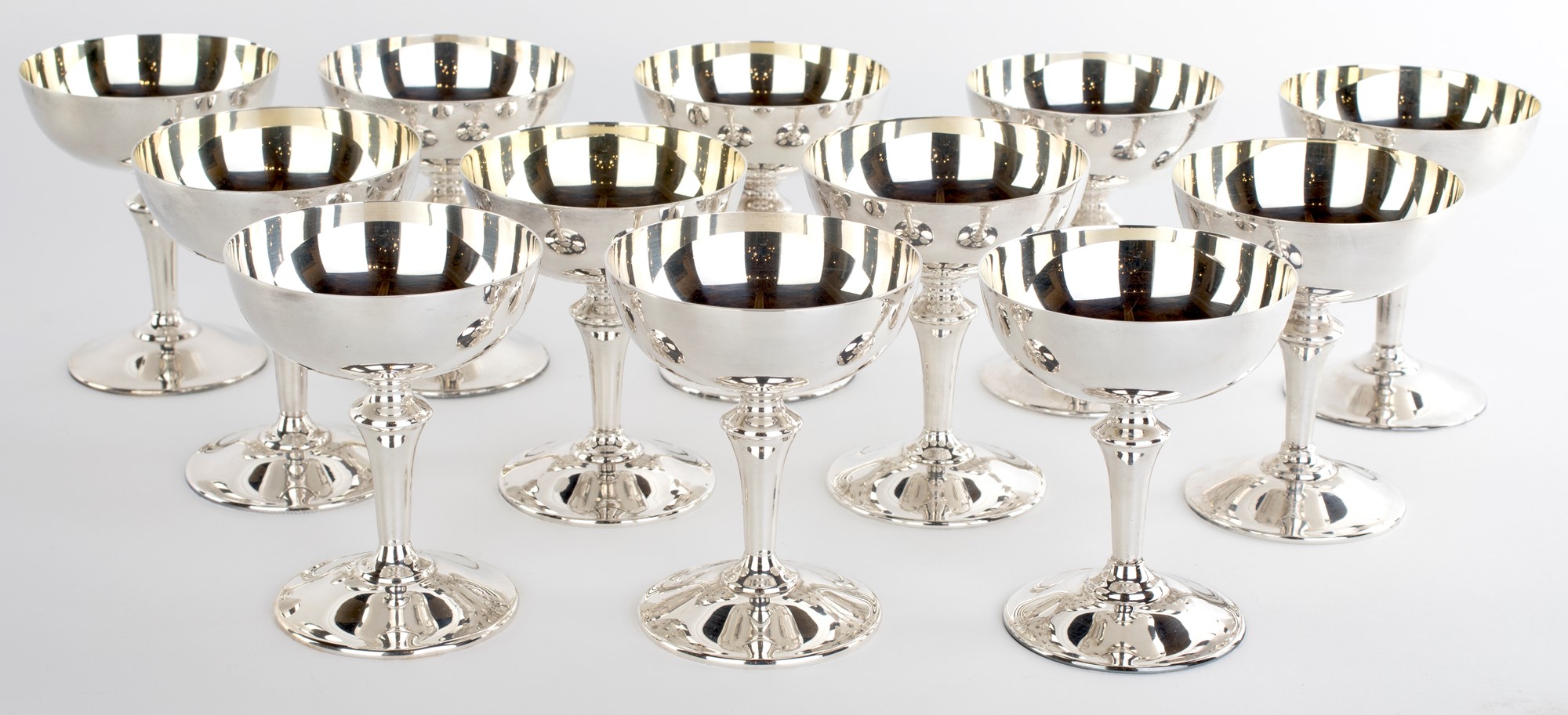 Dodici coppe da champagne in argento con fusto rastremato collegato al calice da breve rocchetto, piede circolare, altezza cm 12 - gr. 1940