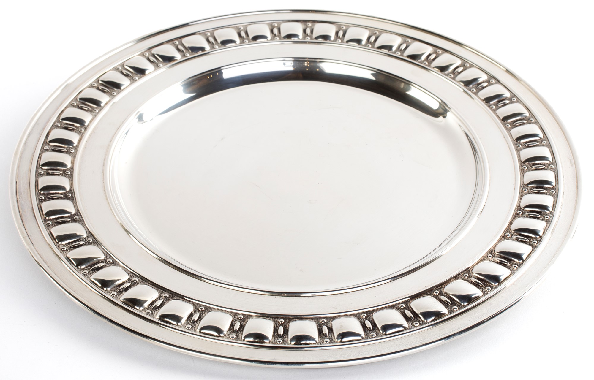 Piatto in argento, Gianmaria Buccellati di forma circolare con tesa percorsa da sbalzi a cuscino alternati a perline emergenti su fondo puntinato, diametro cm 32 - gr. 670