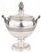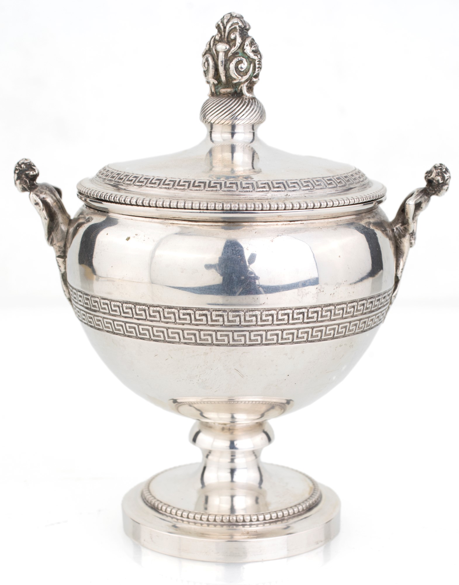 Zuccheriera in argento, argentiere Brandimarte a forma di coppa su piede circolare decorata da tre ordini di fasce sottili con greca cesellata; anse scultoree in forma di cariatide, coperchio sormontato da presa cesellata, 13x11,5x8 - gr. 190