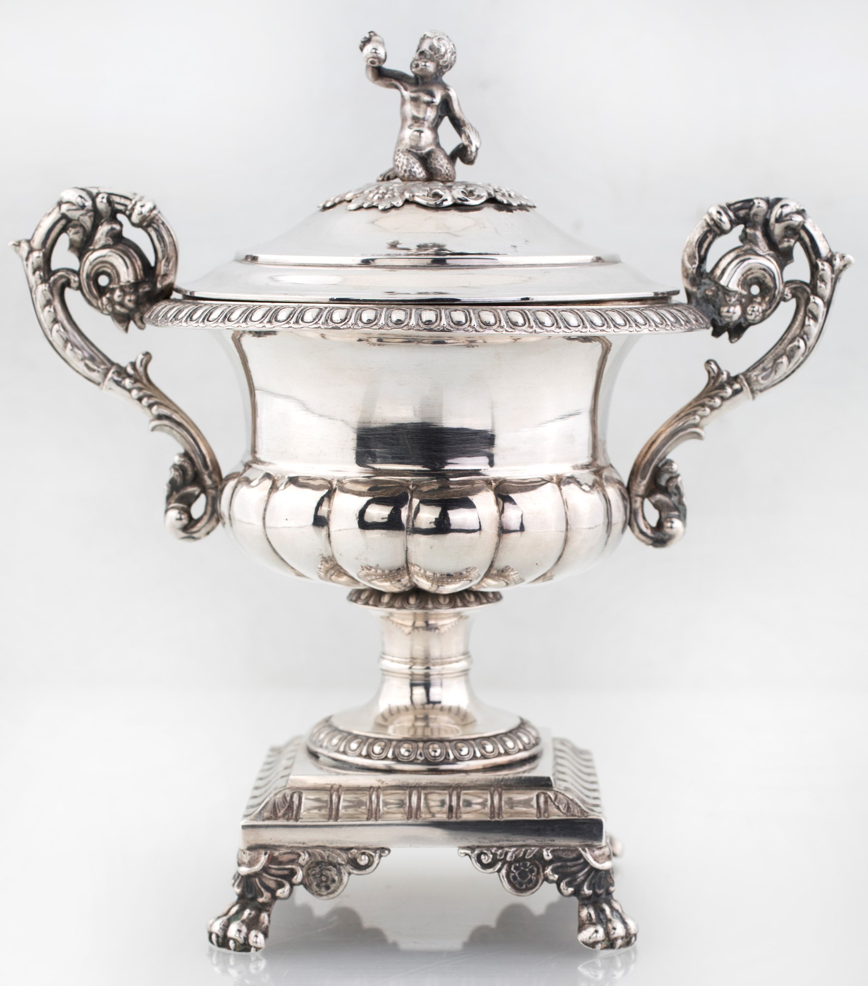 Zuccheriera in argento, Milano 1840 ca., argentiere Francesco Liverti a forma di coppa biansata con coperchio sormontato da figura scultorea di giovane fauno; manici sagomati con rilievi vegetali terminanti a ricciolo, base squadrata sorretta da piedi ferini angolari , 19x18x12 - gr. 360