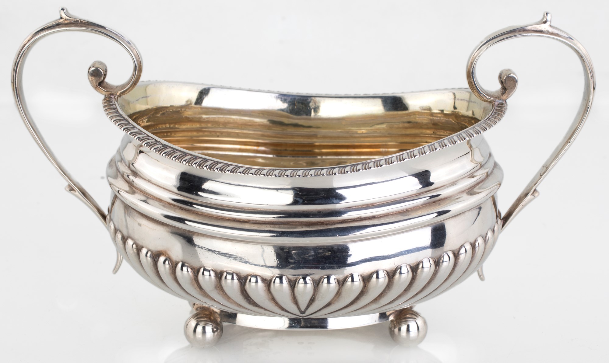 Zuccheriera in argento 925/1000, Londra, epoca Giorgio III, 1815 di forma ovale bombata con baccellature nella parte inferiore, piedi a sfera e manici a nastro, 12x21x12 - gr. 340
