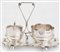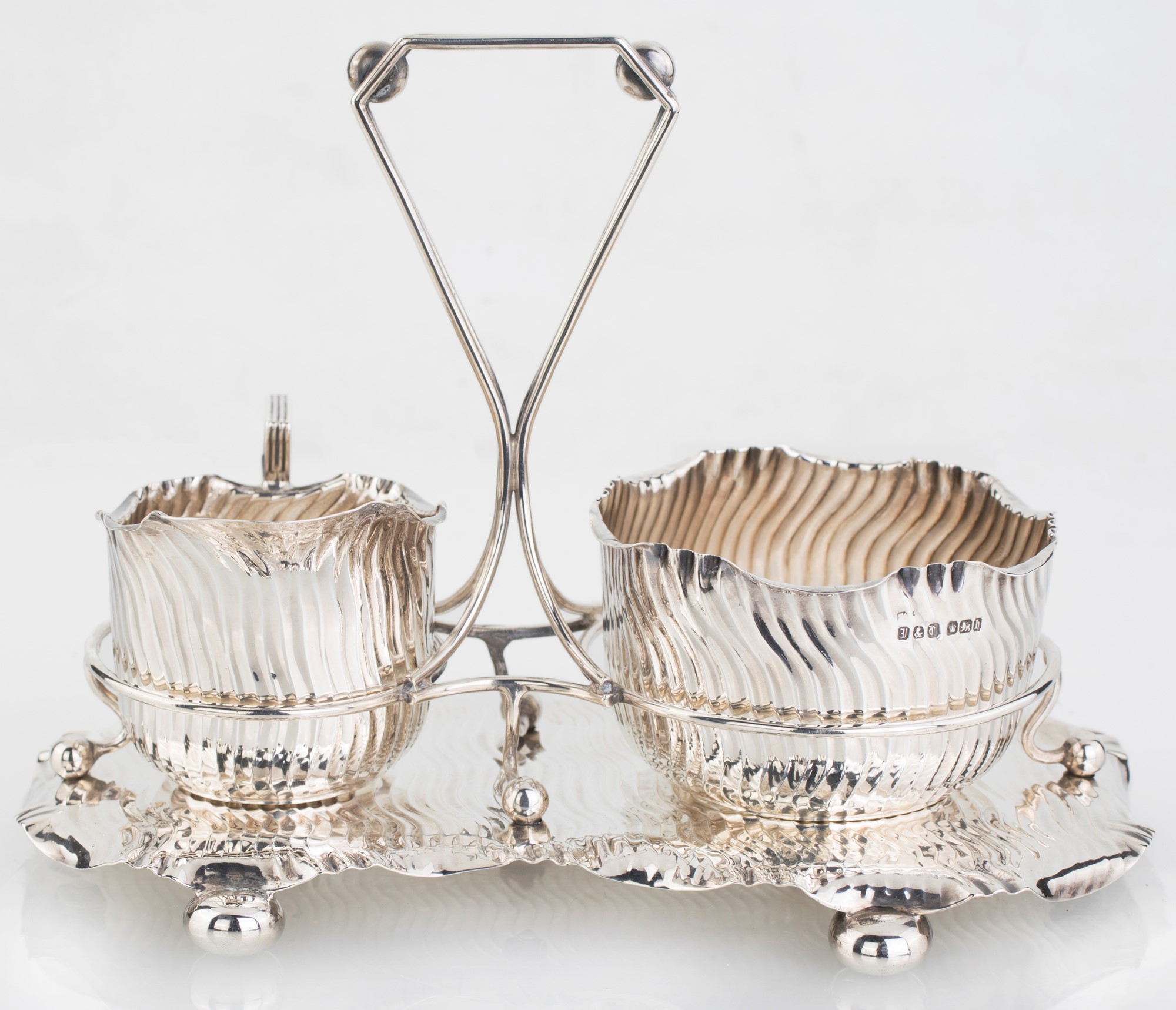Lattiera e zuccheriera in argento 925/1000, città di Sheffield, 1894 trattenuti in uno stand dalle analoghe caratteristiche decorative, con presa centrale e piedi a sfera, 15x21x13 - gr. 392