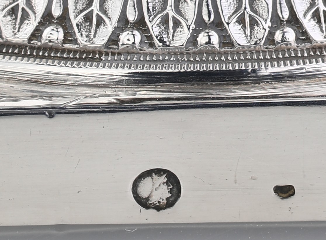 Versatoio in argento 950/1000, Parigi 1793 con corpo ad anfora a superficie liscia decorata da due ordini di palmette poste lungo il profilo del piede e alla base del collo; manico emergente da mascherone terminante a ricciolo centrato da corolla, 30,5x14 - gr. 695