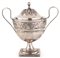 Antica zuccheriera in argento a forma di coppa decorata da una fascia percorsa da volute vegetali e corolle; manici a nastro, coperchio a cupolino abbellito da foglie lanceolate sbalzate ed incise, piede circolare su base quadrata, 12x14,5x8 - gr. 162