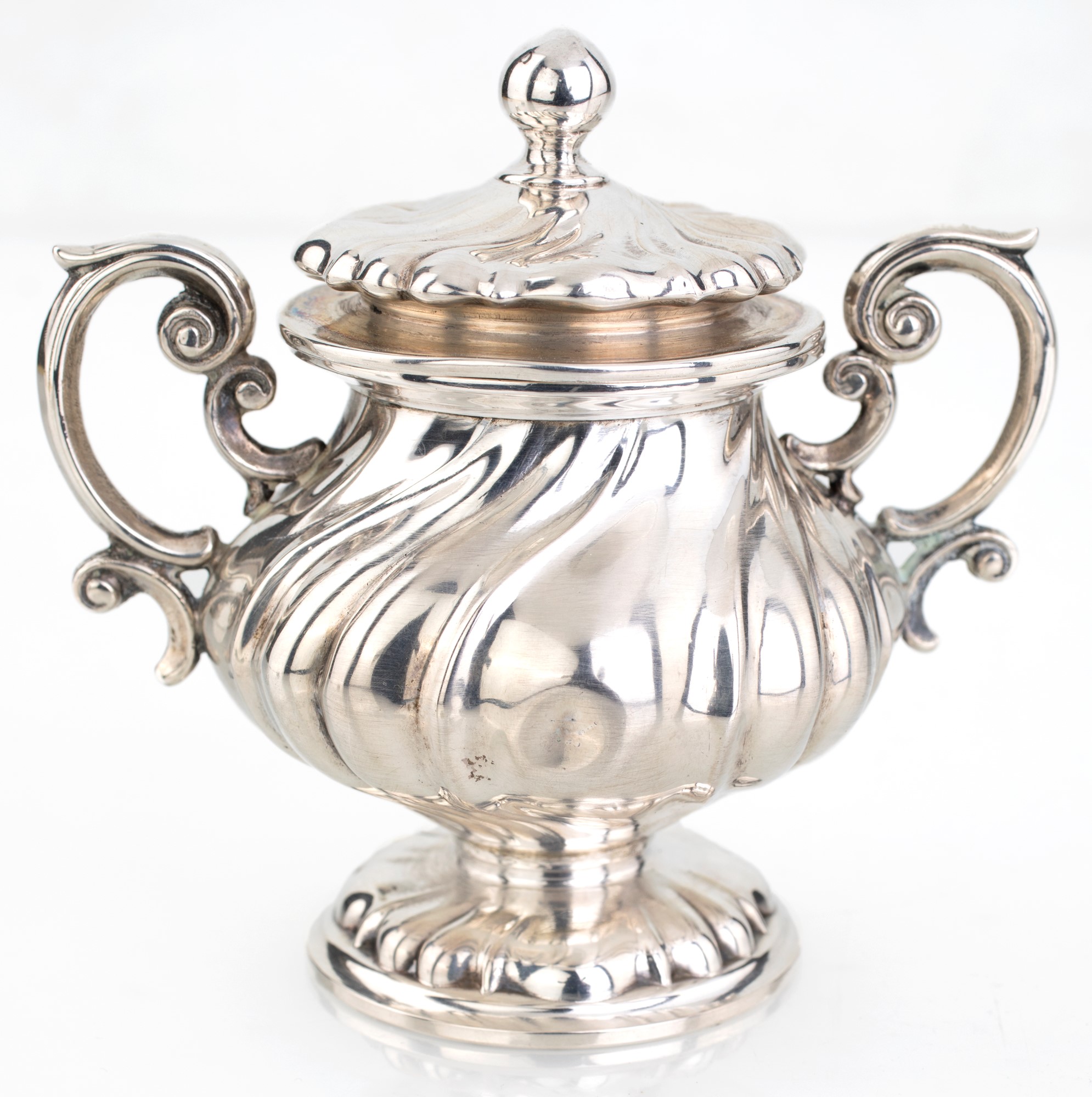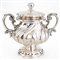 Piccola zuccheriera in argento con lavorazione a torchon, coperchio sormontato da pignetta, manici sagomati, piede circolare; piccola ammaccatura, 9,5x 10,5 - gr. 111