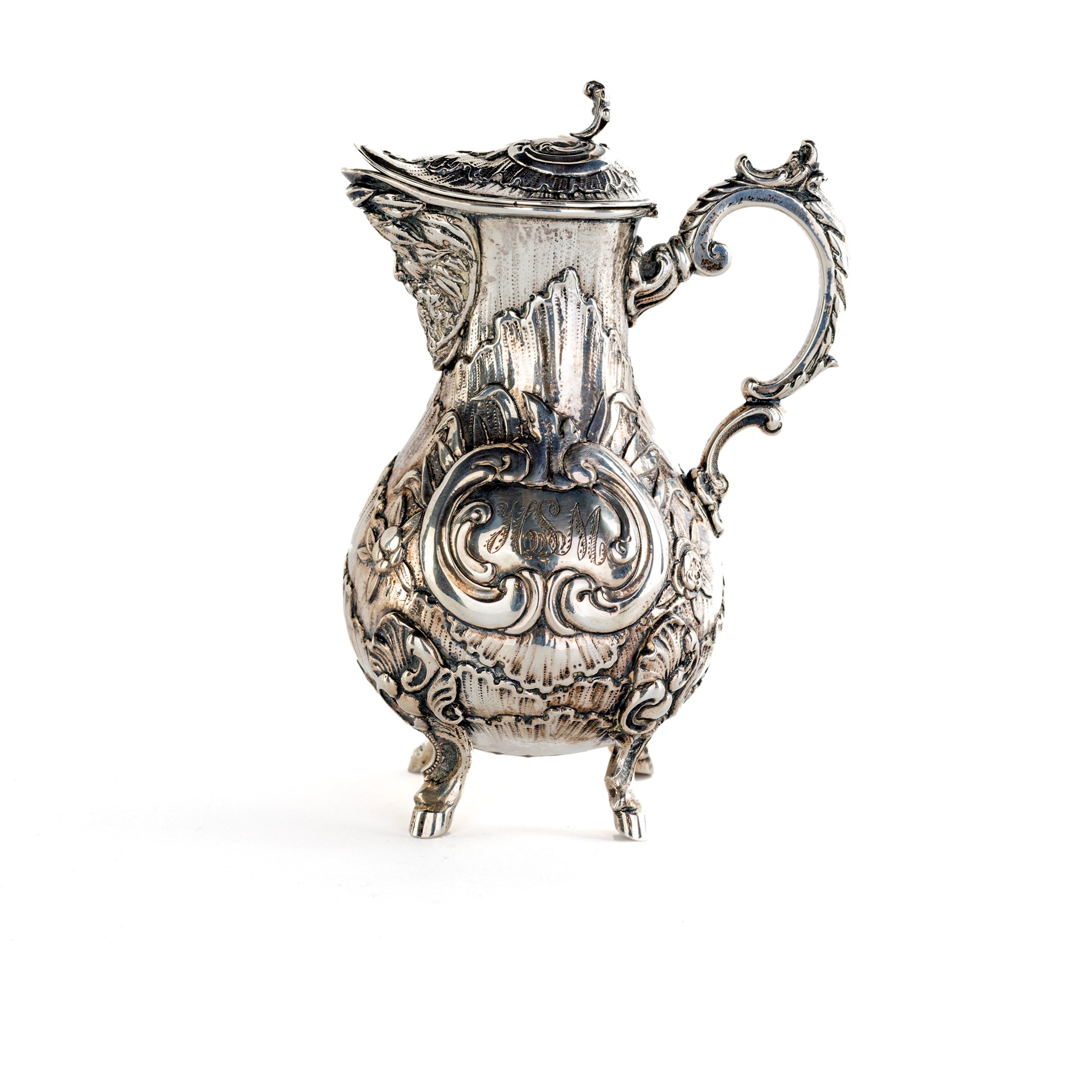 Piccola caffettiera in argento interamente decorata a sbalzo a motivi vegetali e fiori con cartigli contenenti monogramma inciso; manico sagomato, versatoio aderente caratterizzato da mascherone virile, altezza cm 17 - gr. 348