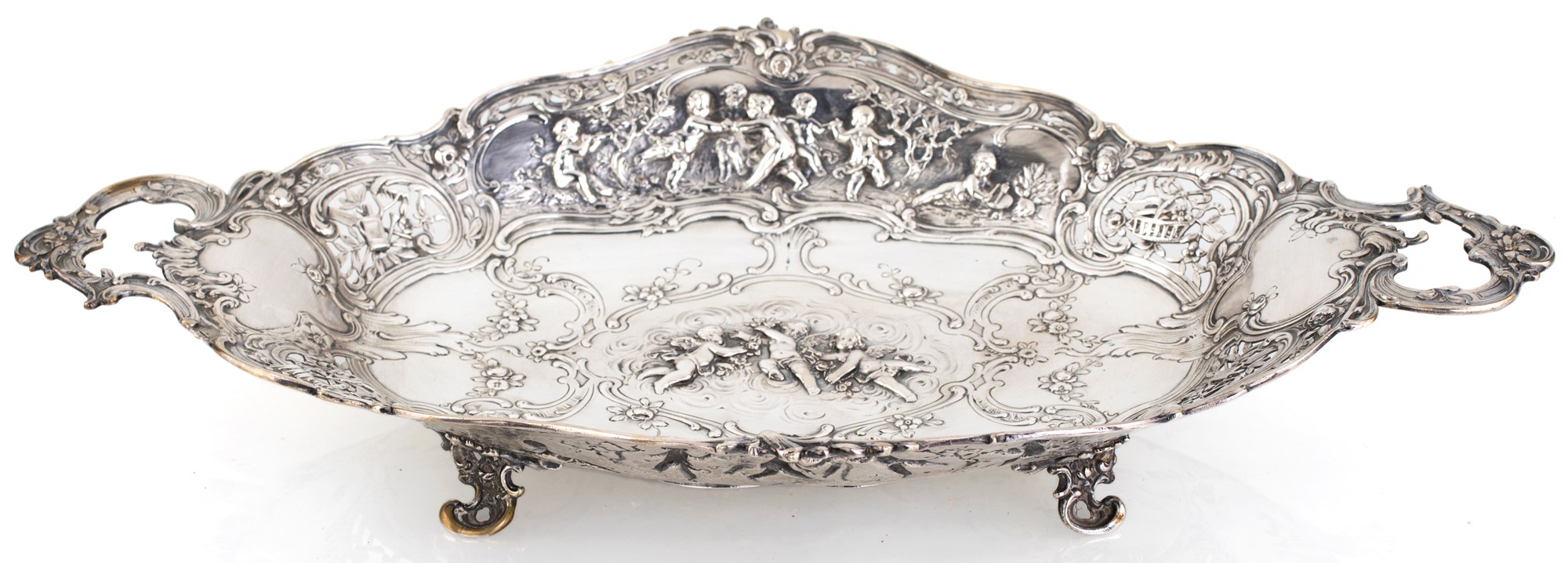 Centrotavola in argento, Germania, fine del XIX secolo di forma ovale polilobata scandita da una larga bordura con cartigli traforati alternati a composizioni allegoriche con amorini danzanti, motivo decorativo ripreso al centro del cavetto entro cornice a volute abbellite da piccole corolle; manici in forma di cartiglio, piedi fitomorfi, 7x47x27 - gr. 830