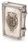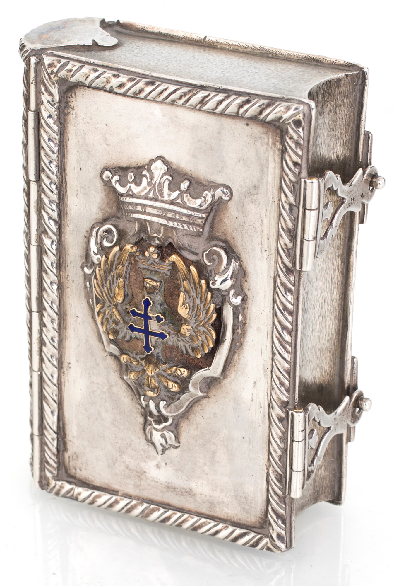 Scatola in argento in forma di libro decorato con stemma con croce patriarcale di Lorena in smalto blu affiancata da ali in bronzo dorato e da uno stemma sbalzato con iniziali S.A.B, 11x8x3,3 - peso lordo gr. 290