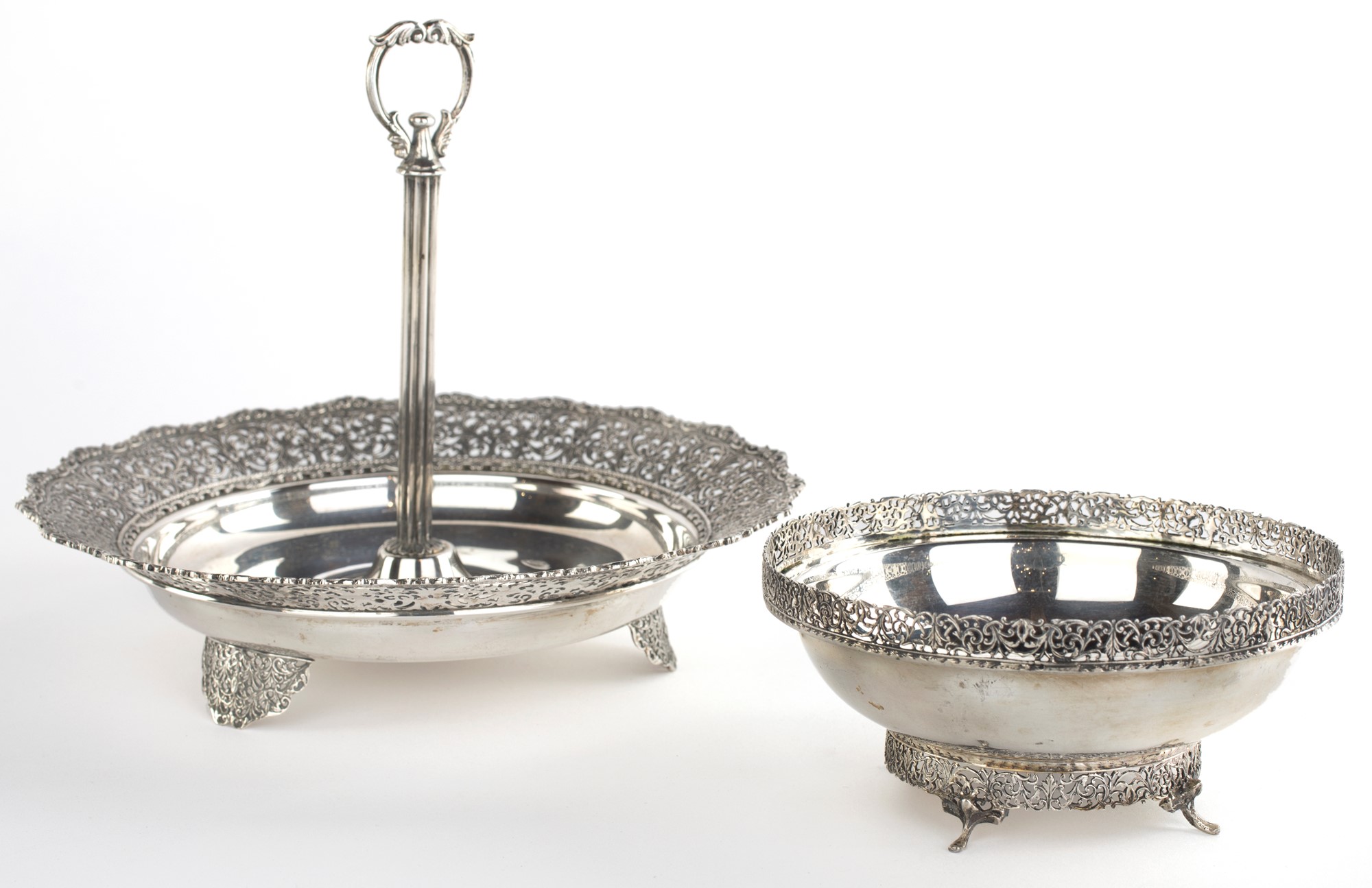 Alzata e coppetta in argento caratterizzate da tesa traforata con fitto intreccio di volute e motivi vegetali, 19x23 e cm 6,5x14 - peso complessivo gr. 530