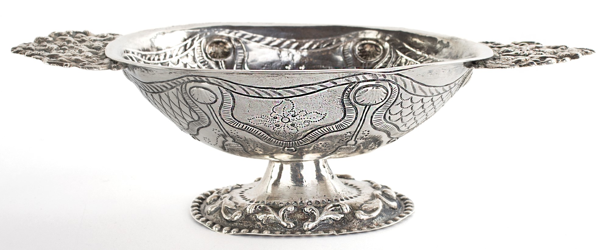 Coppetta in argento sbalzato di forma ovale decorata da festoni con nappe pendenti incisi; manici con figure traforate, piede con profilo sottolineato da volute sbalzate e perline, 7x24x13 - gr. 280