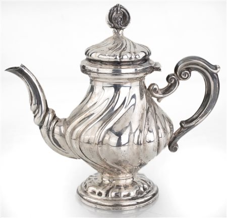 Caffettiera in argento con superficie decorata a nervature elicoidali; coperchio a cupolino incernierato, versatoio e manico sagomati, piede circolare, altezza cm 15 - gr. 178