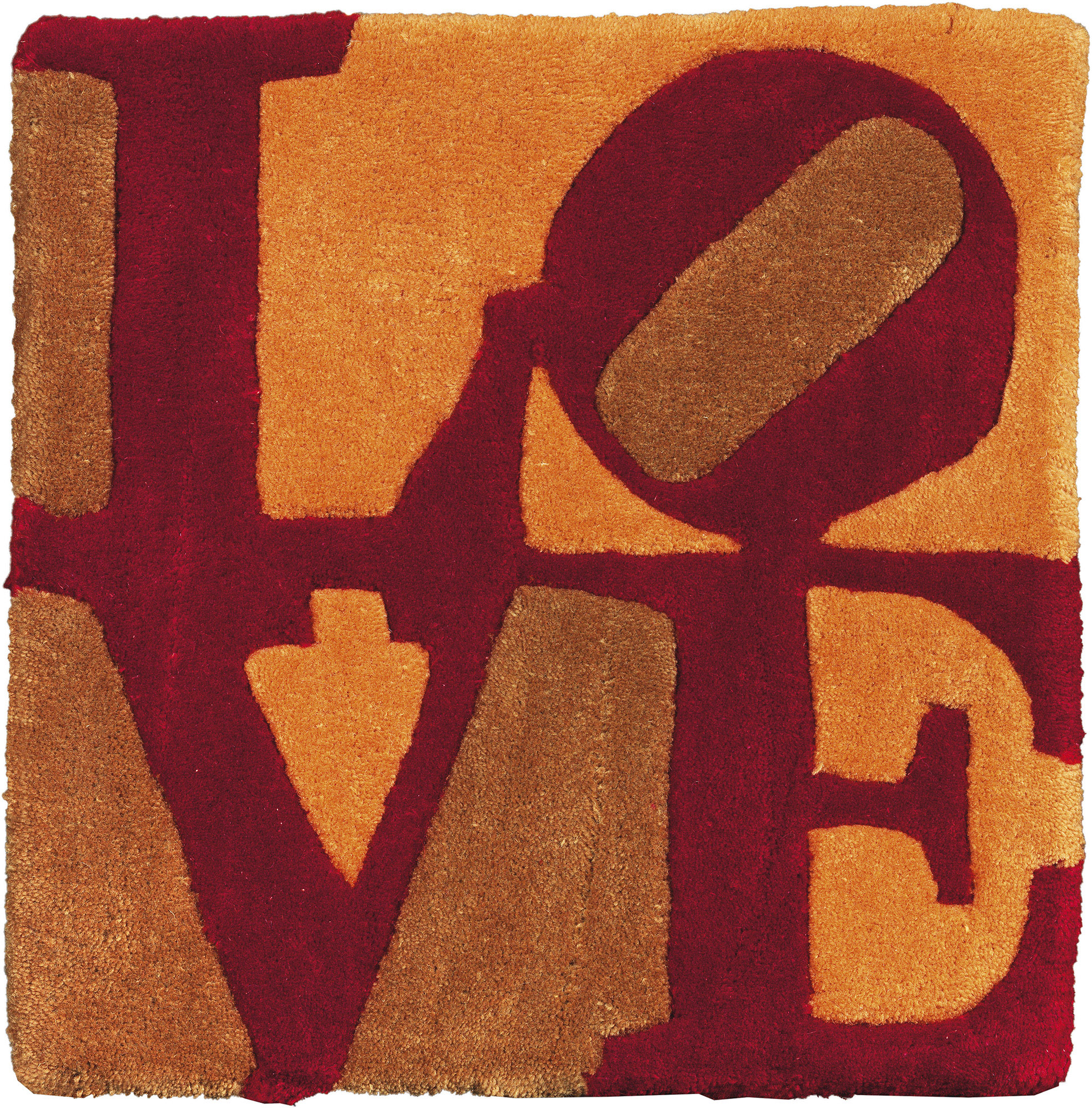 Robert Indiana, New Castle 1928 - Vinalhaven 2018, Fall Love, 2006, Tappeto, multiplo, es. 370/00, cm. 40x40, Al verso: etichetta con dati dell'opera e tiratura., Edizione esclusiva per la Galerie-f.