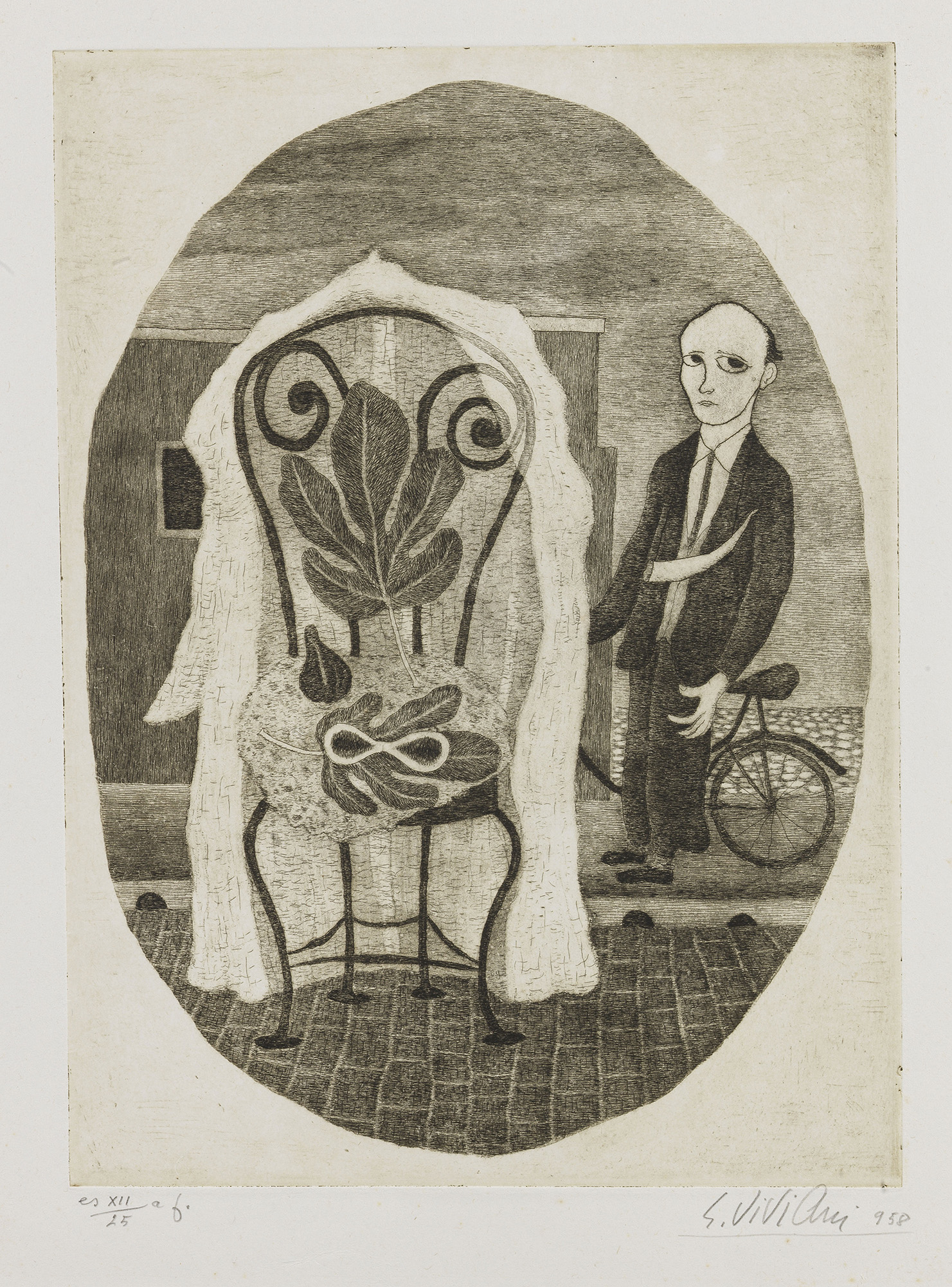 Giuseppe Viviani, Agnano (Pi) 1898 - Pisa 1965, Merciaio e sedia, 1958, Acquaforte su rame, es. XII/25f, cm. 31,8x23,3 (lastra), cm. 39x31 (carta), Firma e data a matita sul margine in basso a destra: G. Viviani 958, in basso a sinistra tiratura: es. XII/25 a f., Terzo stato., Tiratura di 25 esemplari su carta Giappone numerati e firmati, 5 esemplari di prova, firmati, su vari tipi di carta. , Bibliografia: Nicola Micieli, Viviani opera incisoria, catalogo generale, B&V, Pontedera, 1998, p. 200, n. 131, tav. 131.