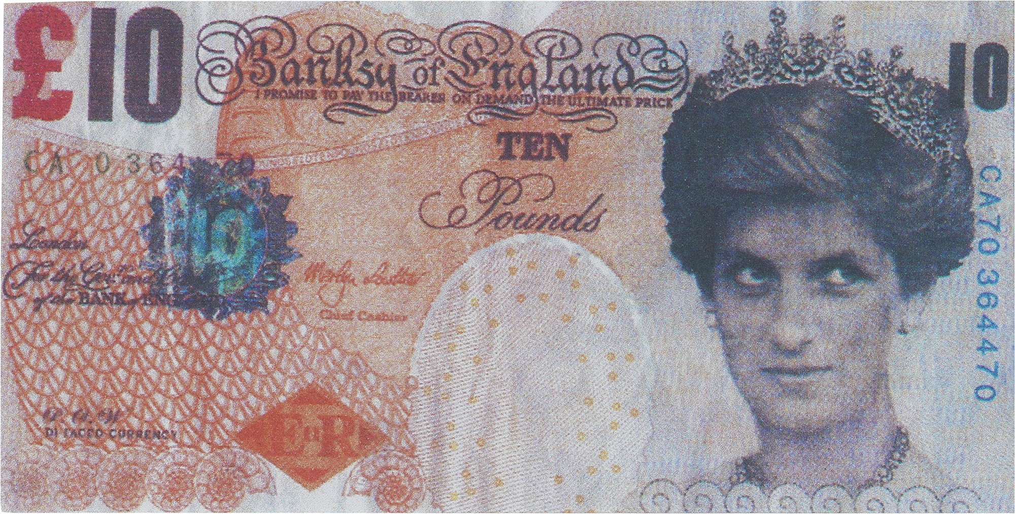 Banksy, Bristol 1974, Banksy of England, Ten Pounds, Serigrafia a colori (recto e verso), cm. 7,5x14,5