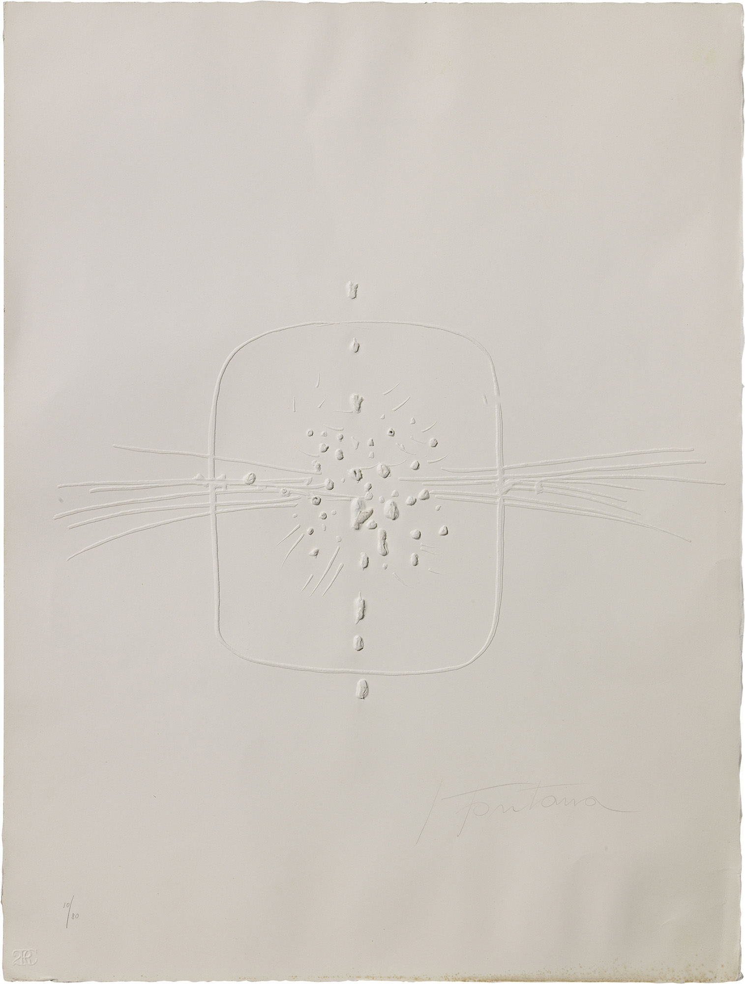 Lucio Fontana, Rosario Santa Fè 1899 - Varese 1968, Concetto Spaziale, 1968, Incisione con rilievi e fori, es. 10/80, cm. 64x48,2 (carta), Firma a matita in basso a destra: L. Fontana, tiratura in basso a sinistra: 10/80, timbro a secco 2RC., Certificato La Spirale 2000 Edizioni d'Arte, Milano., Da una cartella di 6 stampe, tiratura di 80 esemplari più 15 prove d'autore, stampatore 2RC, Roma, editore Galleria Marlborough, Roma., Bibliografia: Camillo Rigo, Harry Ruhé, Lucio Fontana, incisioni, grafica, multipli, pubblicazioni..., Reverdito Edizioni, Trento, 2007, p. 63, n. E-40.