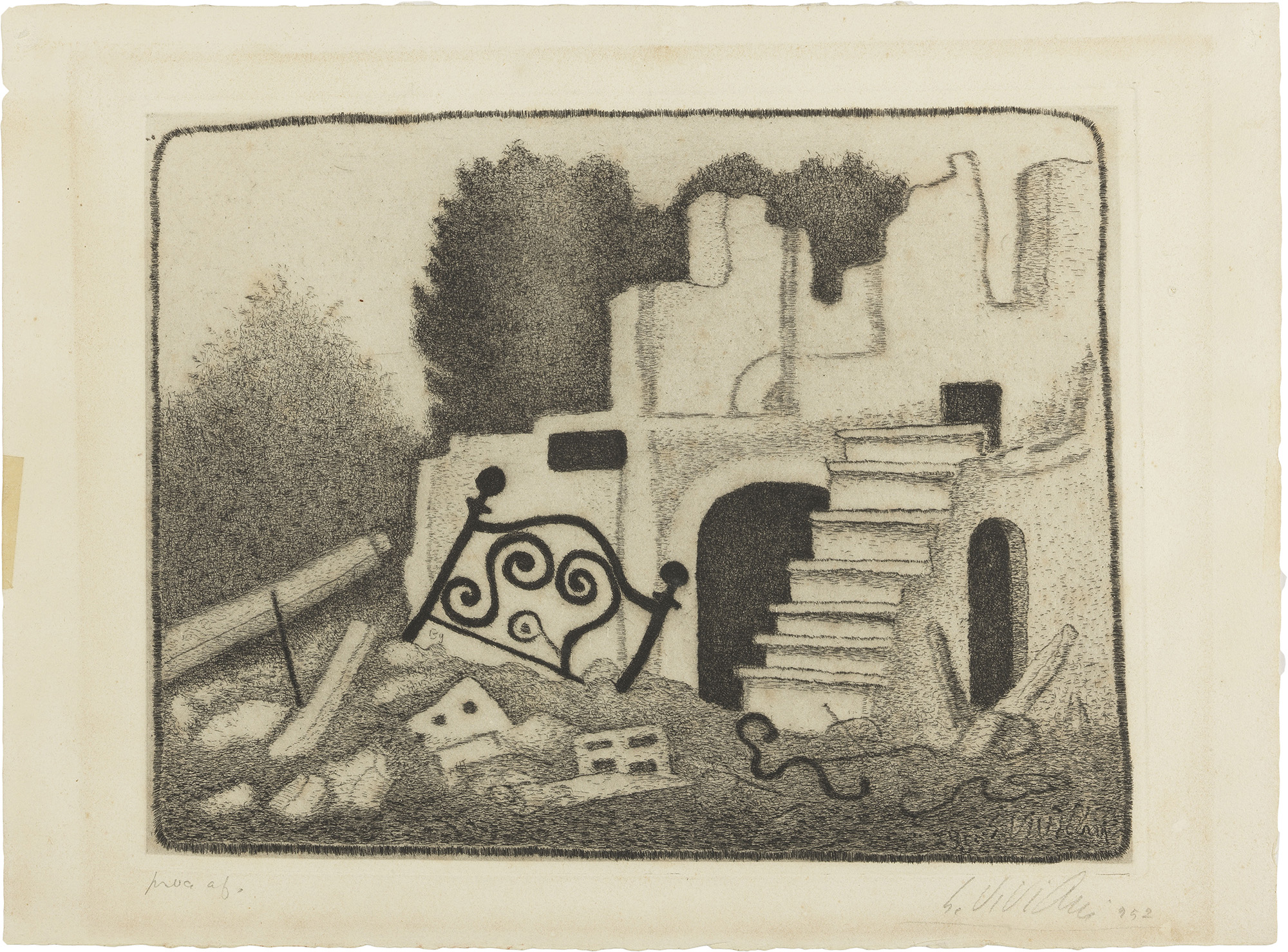 Giuseppe Viviani, Agnano (Pi) 1898 - Pisa 1965, Letto e macerie, 1952, Acquaforte su rame, es. prova a.p., cm. 22,3x29,8 (lastra), cm. 27,8x38,4 (carta), Firma e data in lastra in basso a destra: G. Viviani / 952, firma e data a matita sul margine in basso a destra: G. Viviani 952, tiratura in basso a sinistra: prova a.p., Terzo stato, tiratura di 50 esemplari numerati e firmati, di cui 34 su carta Cina, Giappone e carta antica e 16 su carta Oxford e India incollate, più alcuni esemplari di prova firmati su diversi tipi di carta., Bibliografia: Nicola Micieli, Viviani opera incisoria, catalogo generale, B&V, Pontedera, 1998, p. 197, n. 111, tav. 111.