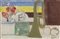 Bruno Saetti, Bologna 1902 - 1984, Natura morta, 1982, Affresco su tela, cm. 36,4x55,2, Firma in basso a destra: Saetti; firma, luogo e data al verso sulla tela: Saetti / Venezia 1982.