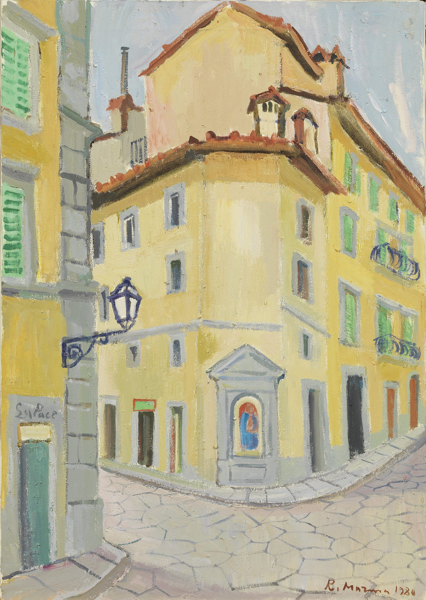 Rodolfo Marma, Firenze 1923 - 1998, Angolo di città, 1980, Olio su tela, cm. 70x50, Firma e data in basso a destra: R. Marma 1980; firma, data e titolo al verso sulla tela: R. Marma 1980 / "Angolo di città" / (via Ruote e via S. Gallo).