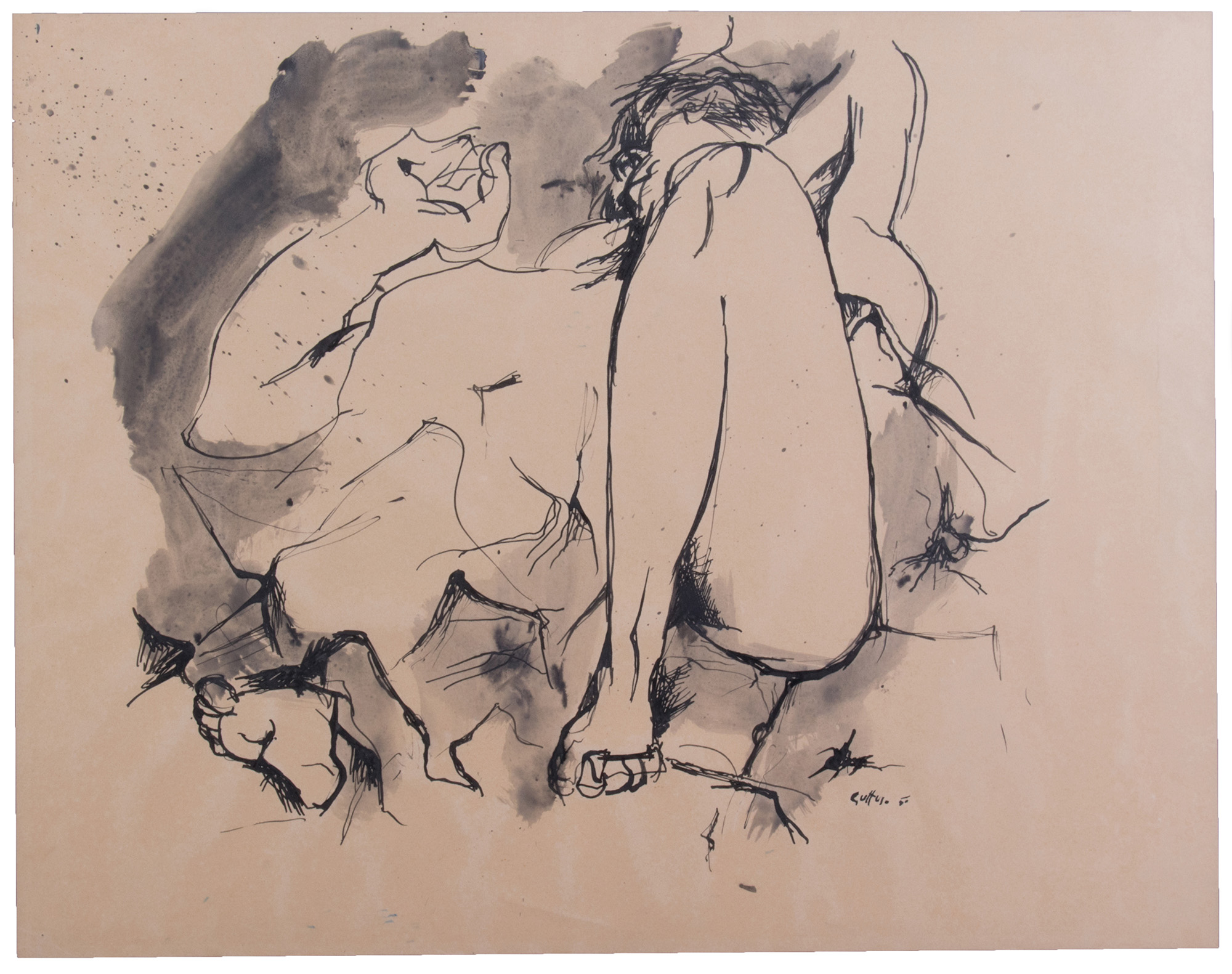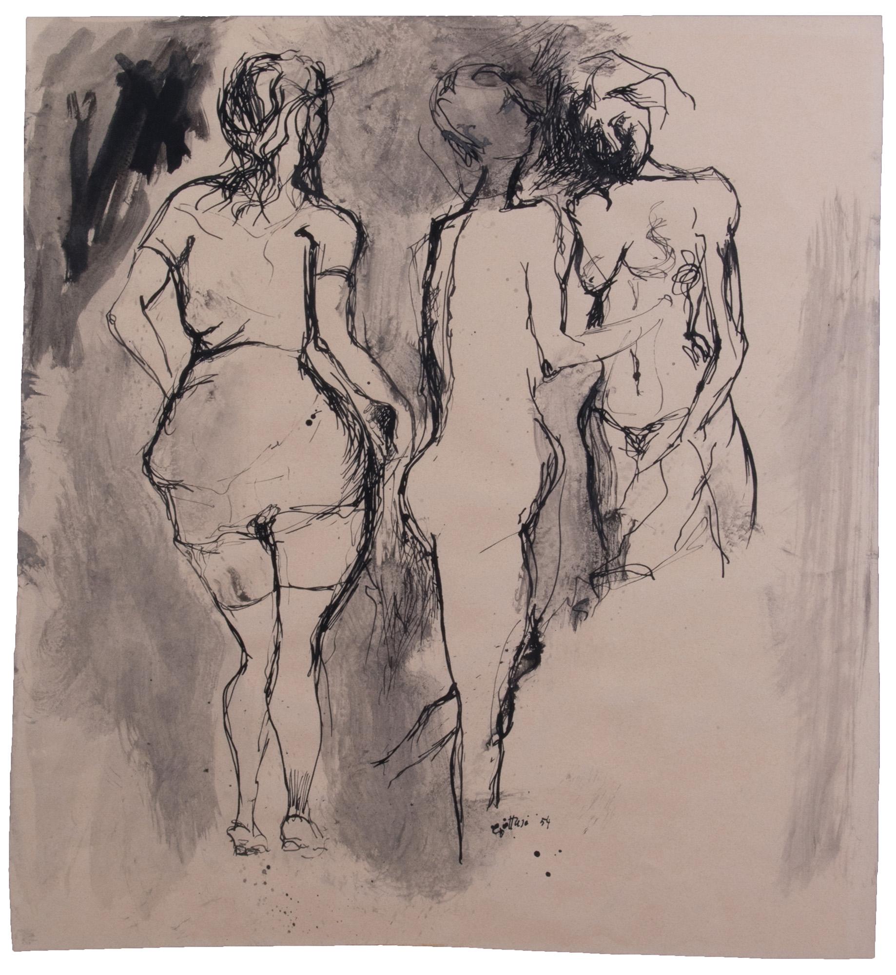 Renato Guttuso, Bagheria (Pa) 1912 - Roma 1987, Due disegni, A) Nudo disteso, 1950, china su carta, cm. 50x64. Firma e data in basso a destra: Guttuso 50;, B) Studi di nudi, 1954, china su carta, cm. 56,5x51,3. Firma e data in basso al centro: Guttuso 54.