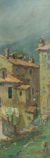Anonimo Case a Vico Pisano Olio su tavola, cm. 60x20 Firma illeggibile in basso a destra. Sul verso: firma illeggibile e titolo.