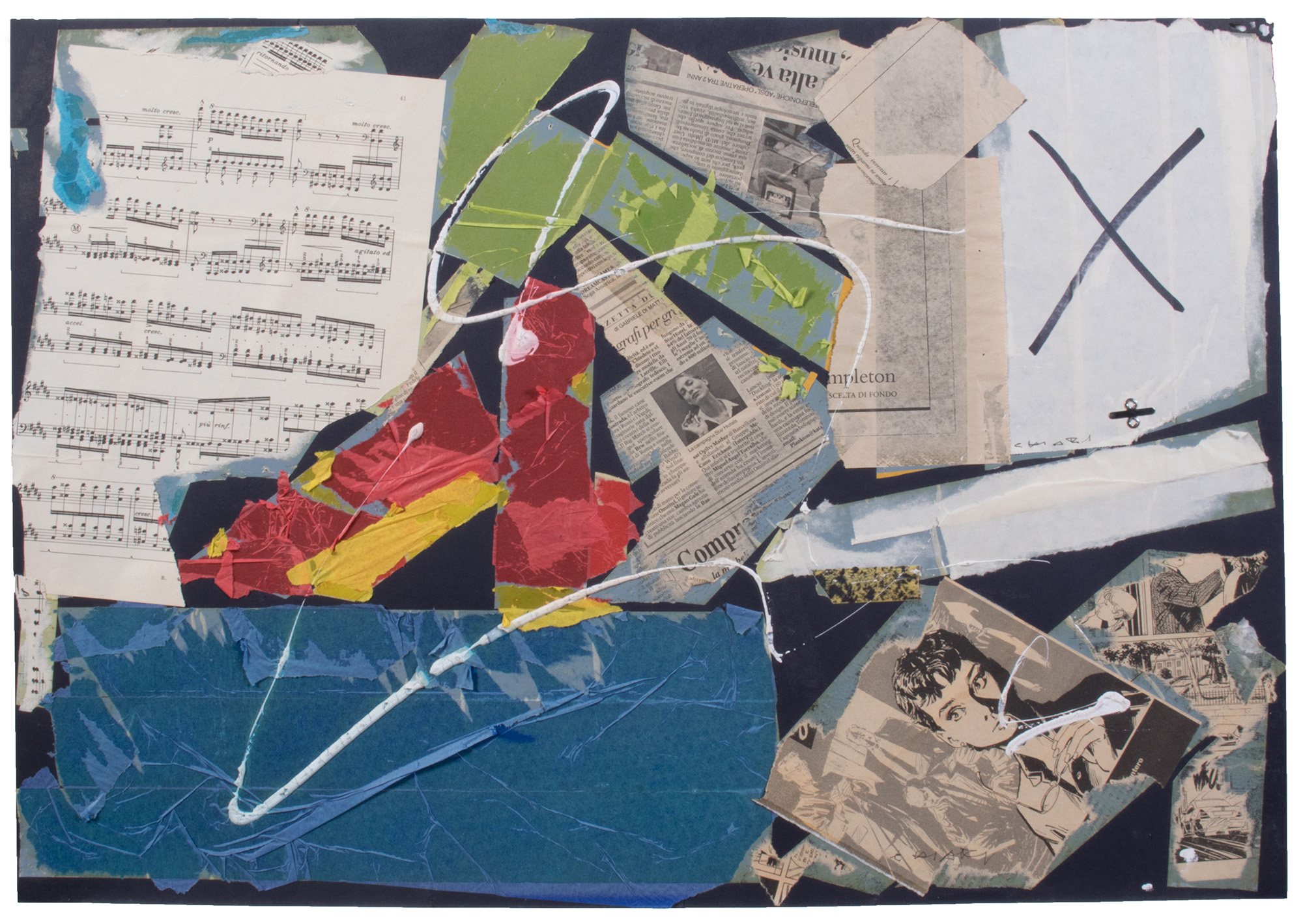 Giuseppe Chiari, Firenze 1926 - 2007, Senza titolo, Collage e tecnica mista su cartoncino, cm. 50x70, Firma al centro verso destra e in basso a destra: Chiari.