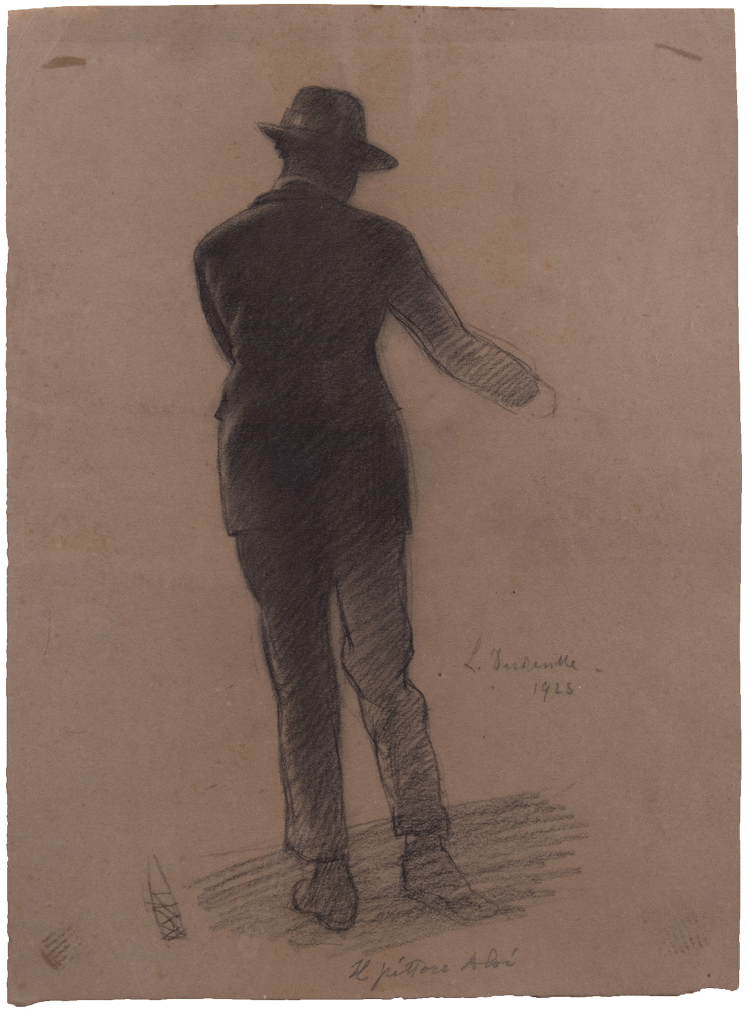 Leonardo Dudreville, Venezia 1885 - Ghiffa (Vb) 1975, Il pittore Aloi (studio per Amore Discorso I), 1923, Carboncino su carta, cm. 31,5x23,3, Firma e data in basso a destra: L. Dudreville / 1923, titolo in basso al centro: Il pittore Aloi. Al verso, su un cartone di supporto: timbro e etichetta Galleria Fonte d'Abisso Edizioni, Modena, con n. 1244/MO 195., Bibliografia di riferimento;, L. Dudreville, a cura di Paolo Thea, Milano, Galleria d'Arte Moderna, 11 giugno - 6 settembre 1987, pp. 62, 66.