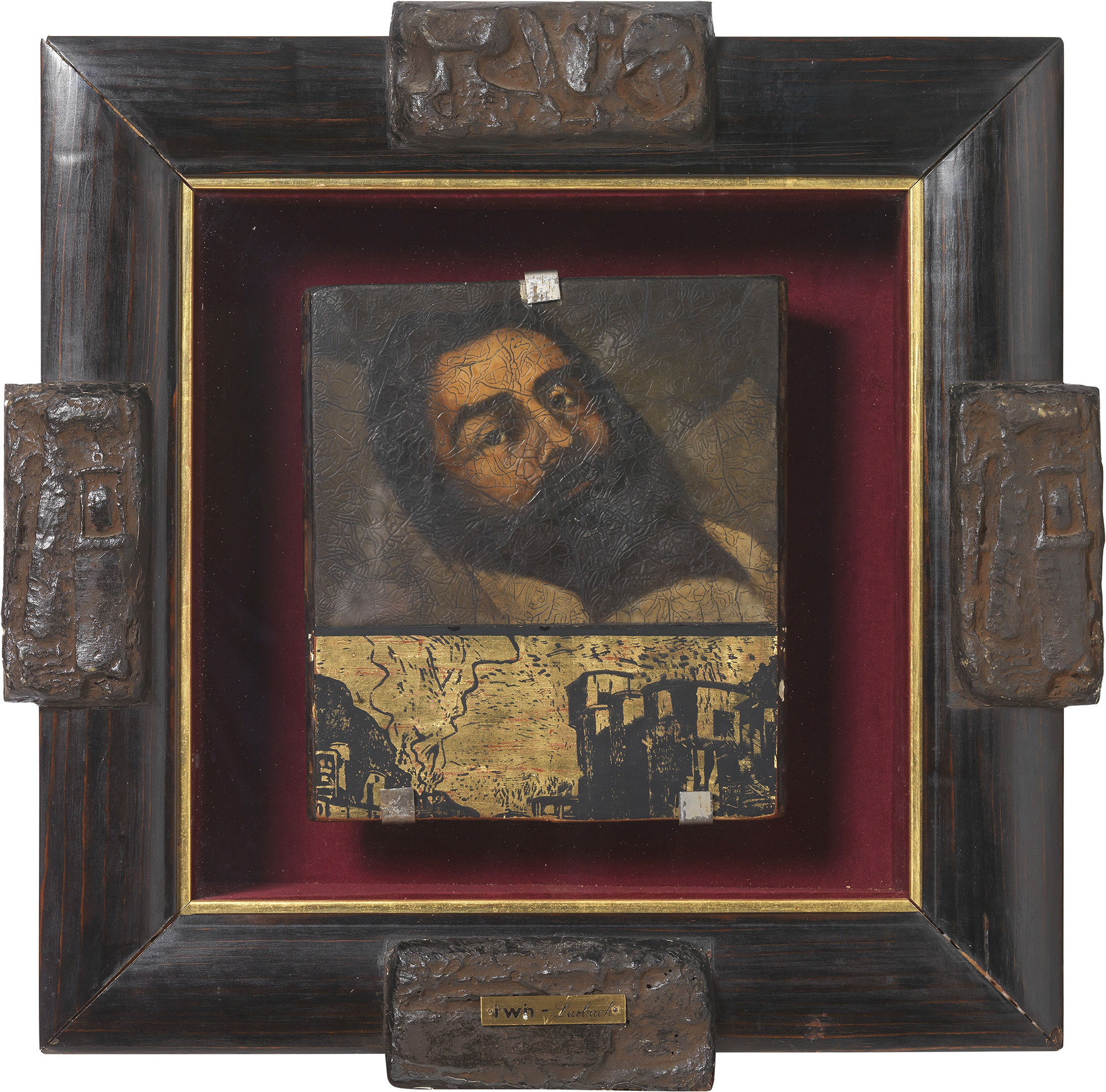 Irwin, Collettivo di artisti sloveni, XX secolo, Senza titolo, Tecnica mista e collage su tavola, cm. 65x65x16 (con cornice), Targhetta sul fronte: Irwin Laibach; timbro al verso: Neue Slovenische Kunst.