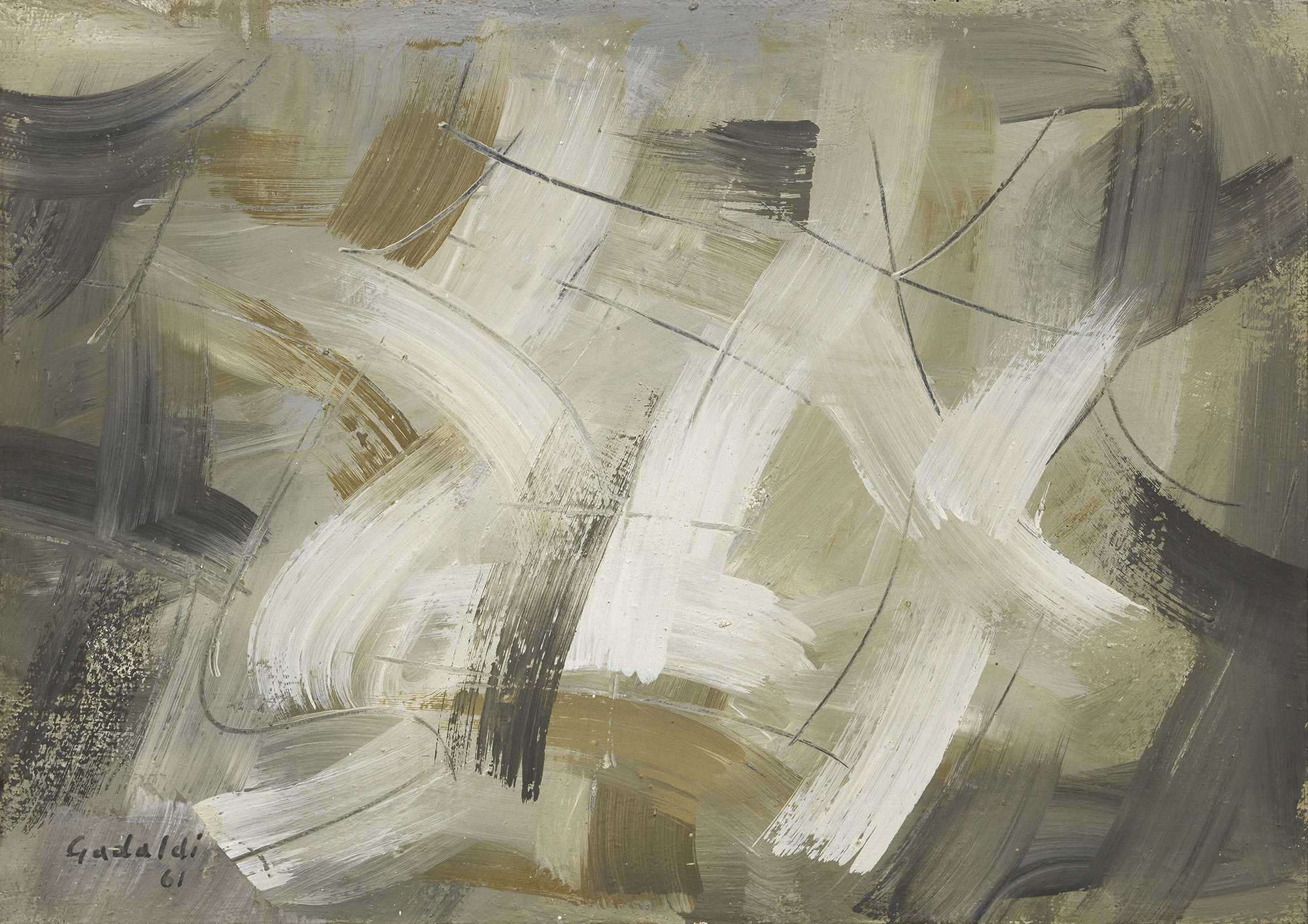 Silverio Gadaldi, Brescia 1918 - Milano 1993, Luci da lontano, 1961, Olio su tela, cm. 50,5x70, Firma e data in basso a sinistra: Gadaldi / 61; firma, titolo e data al verso sulla tela: Gadaldi / Luci da / lontano - '61 / settembre 961.