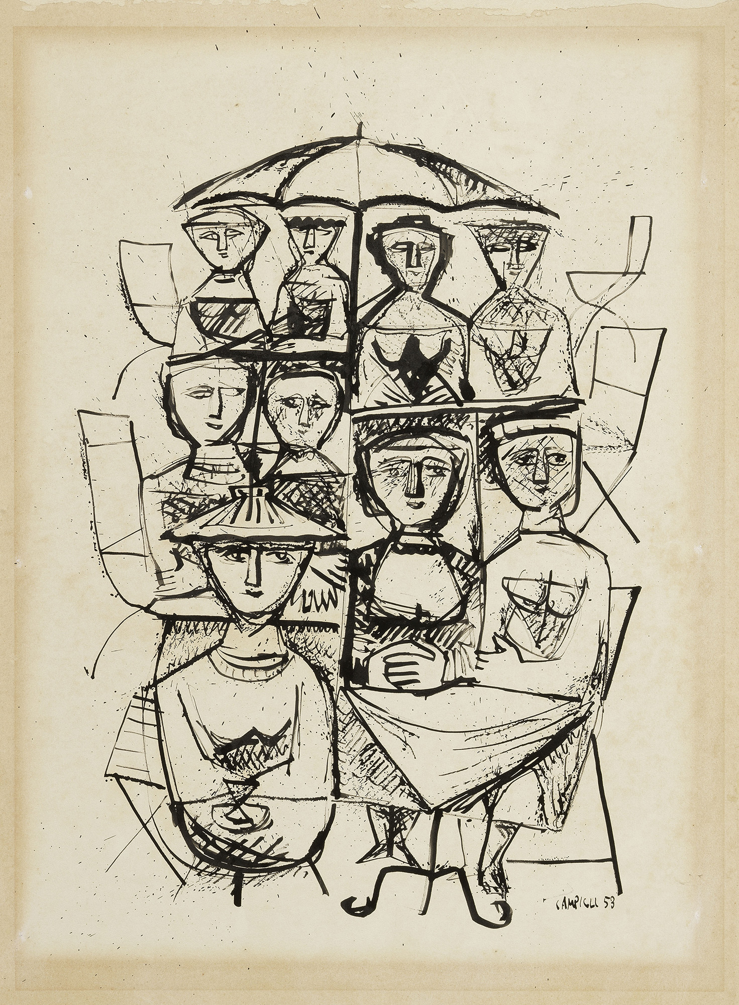 Massimo Campigli, Berlino 1895 - Saint-Tropez 1971, Donne ai tavolini, 1953, China su carta applicata su cartone, cm. 66,8x50, Firma e data in basso a destra: Campigli 53., Storia: Collezione R.R., Bucarest; Collezione G.P., Bolzano; Collezione privata, Bibliografia: Massimo Campigli, Scrupoli. Con 5 disegni di Campigli, Edizioni del Cavallino, Venezia, 1955, p. 47;, Lisa Licitra Ponti, Edizioni d'arte: "Scrupoli" di Campigli, in Domus, n. 314, gennaio 1956, p. 31;, Massimo Campigli, Di me e della mia pittura, in Carte Segrete, anno I, n. 1, gennaio - marzo 1967, p. 155;, Nicola Campigli, Eva Weiss, Marcus Weiss, Campigli, catalogue raisonné, vol. II, Silvana Editoriale, Milano, 2013, p. 642, n. 53-006.