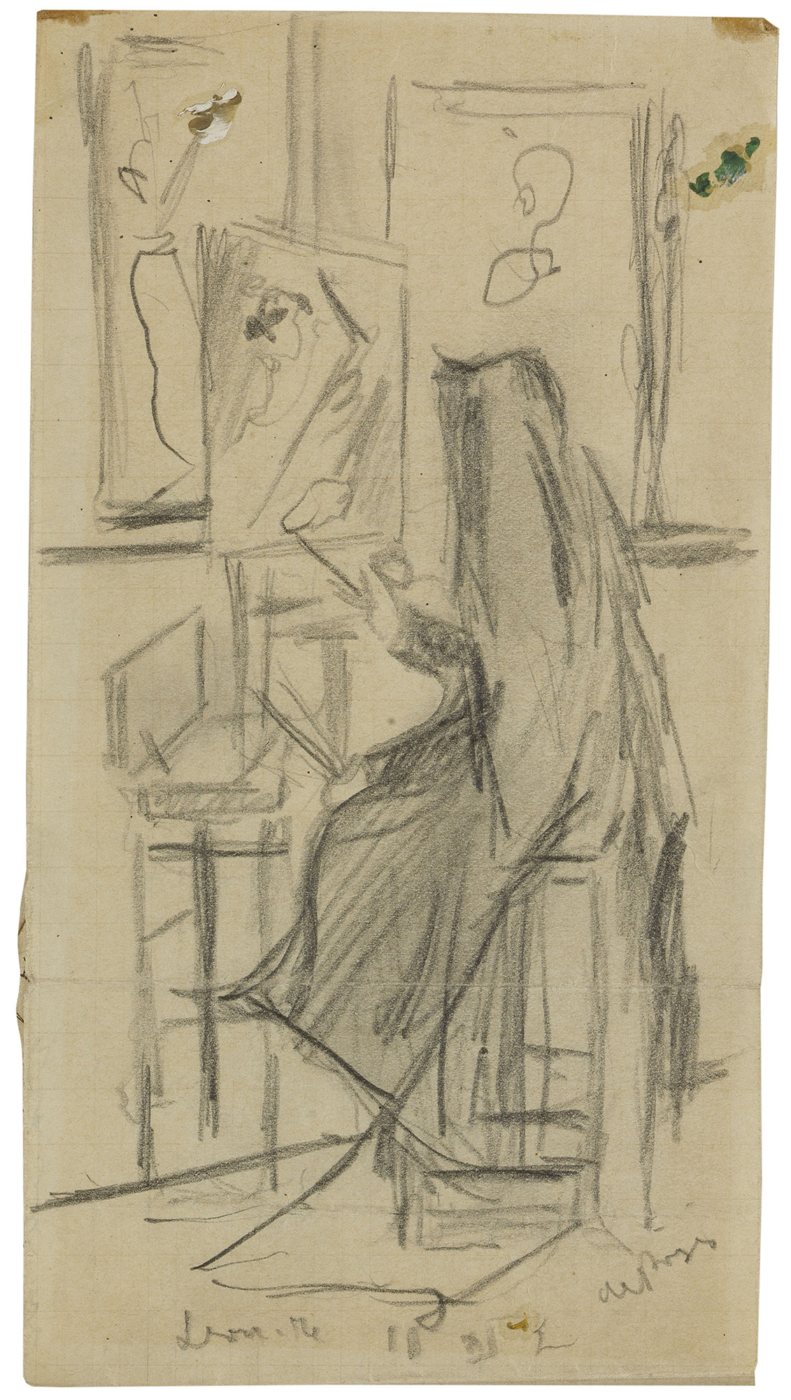 Filippo de Pisis, Ferrara 1896 - Milano 1956, Due disegni, A) Ritratto, matita su carta, cm. 16,2x10,4. In basso a destra: FdeP / [...];, B) Studio di artista, matita su carta, cm. 19,5x10,5. Firma e scritta in basso: de Pisis / [...] / 10 XI [20].