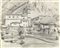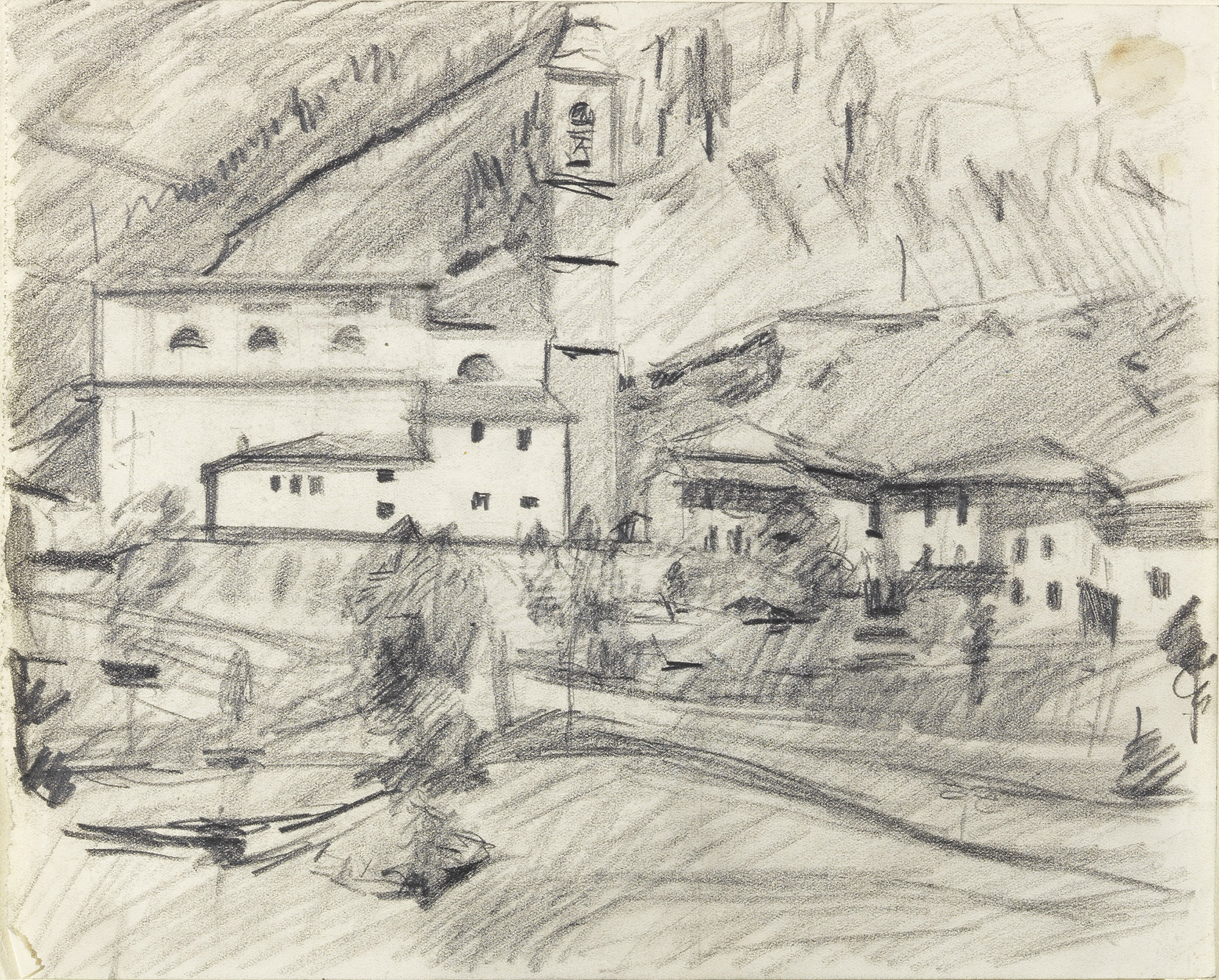 Mario Sironi, Sassari 1885 - Milano 1961, Paesaggio con chiesa, Matita su carta, cm. 21,5x26,8