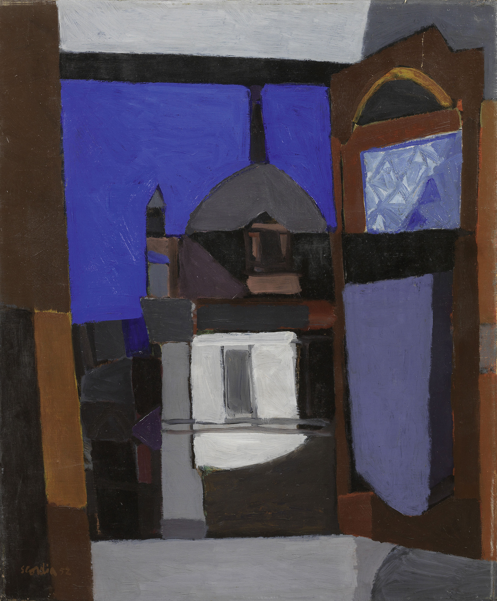 Antonio Scordia, Santa Fè 1918 - Roma 1988, Finestra romana, 1952, Olio su tela, cm. 73x60,5, Firma e data in basso a sinistra: Scordia 52. Al verso sulla tela: etichetta Galleria Bonino, Buenos Aires, con n. 13.