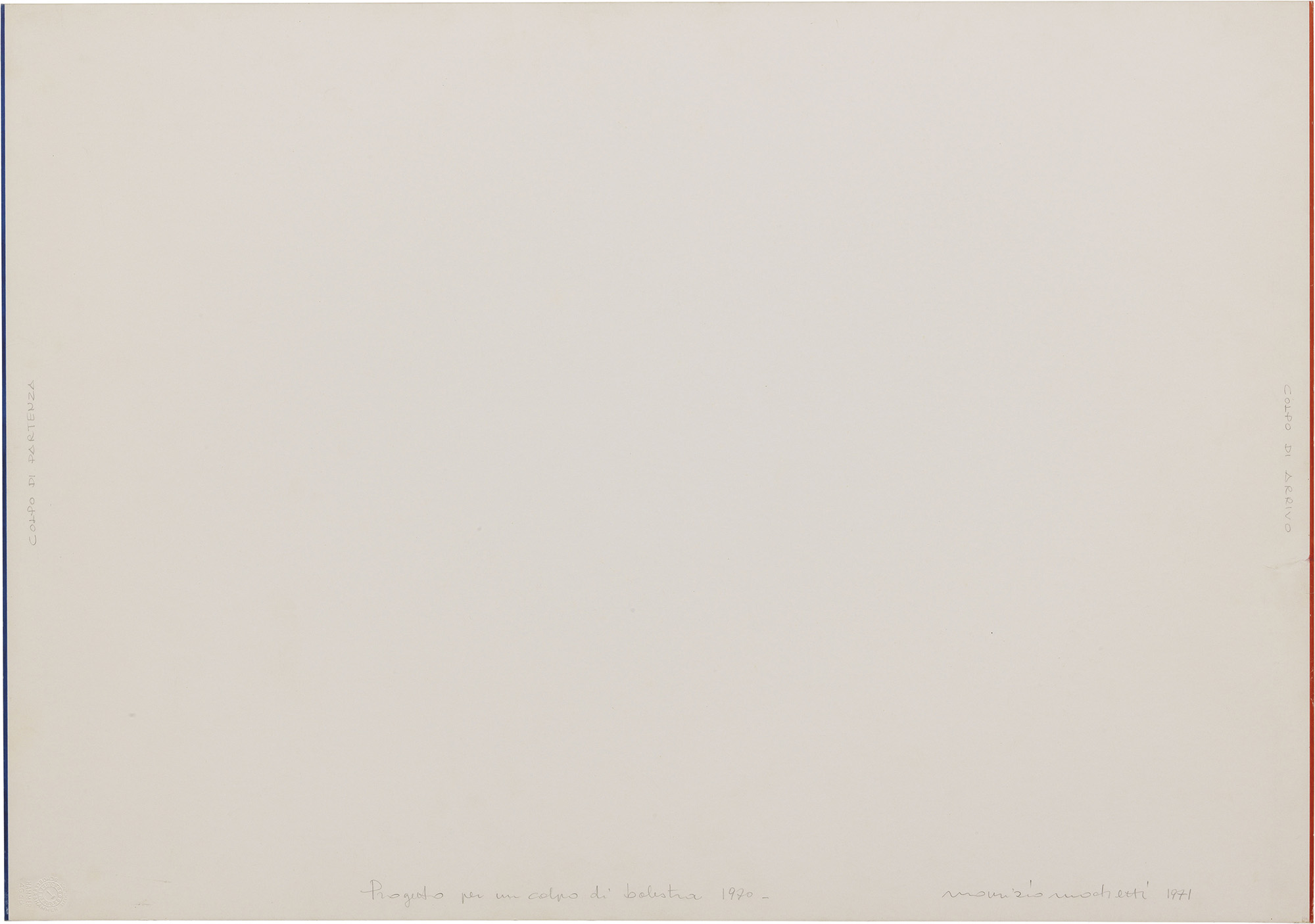 Maurizio Mochetti, Roma 1940, Colpo di balestra, 1971, Tecnica mista su cartoncino, cm. 51x72,8, Firma e data in basso a destra: Maurizio Mochetti 1971, titolo in basso a centro: Progetto per un colpo di balestra 1970.