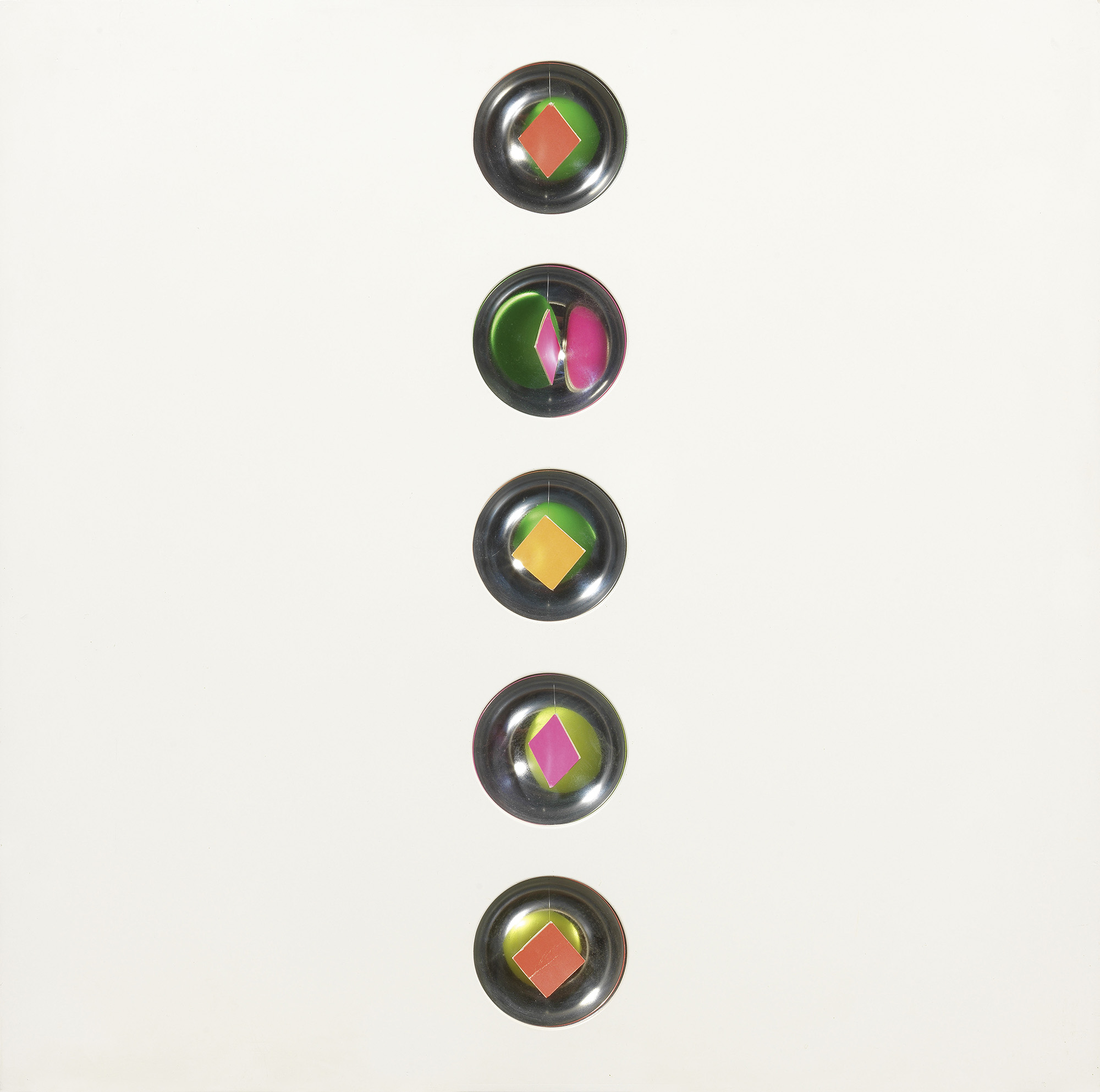 Edoardo Landi, San Felice sul Panaro (Mo) 1937, Riflessione sferica verticale, 1967, Semisfere in acciaio cromato e cartoncini serigrafati su legno dipinto, cm. 70x70x8,5, Titolo, firma e data al verso: Riflessione / sferica / verticale / Edoardo Landi 67: timbro 1967., Foto autenticata dall'artista.