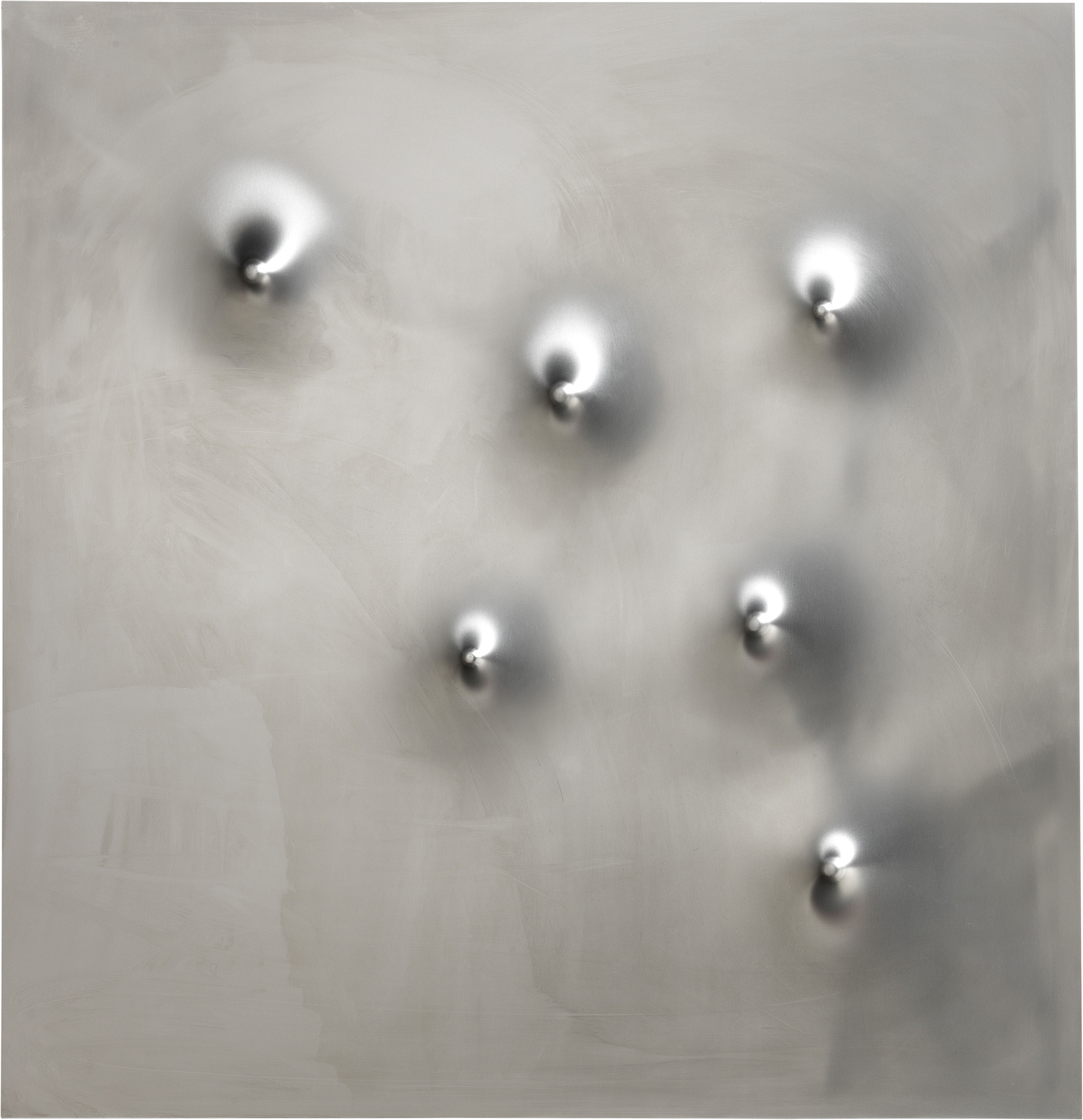 Angelo Brescianini, Palazzolo sull'Oglio (Bs) 1948, N. 6 spari di fucile cal. 12, 2015, Spari su lastra di acciaio inox, cm. 125x125, Titolo, firma e numero d'archivio al verso: N. 6 spari fucile cal. 12 / lastra in acciaio inox / Brescianini / Angelo / Arch. N. / BA02485102: etichetta Catalogo Ragionato / delle Opere / di Angelo Brescianini / © a cura di Antonio Falbo, con n. repertorio BA02485102: etichetta con n. 3843 e timbro Lattuada Studio, Milano., Foto autenticata dall'artista su certificato Catalogo Ragionato delle Opere di Angelo Brescianini, con timbro dell'artista, n. repertorio BA02485102 e etichetta con n. 3843 Lattuada Studio, Milano., Bibliografia: Antonio Falbo, Angelo Brescianini. A ferro e... fuoco. Opere. Works, Edizioni Lattuada Studio, Milano, pp. 117, 146, n. BA02485102.
