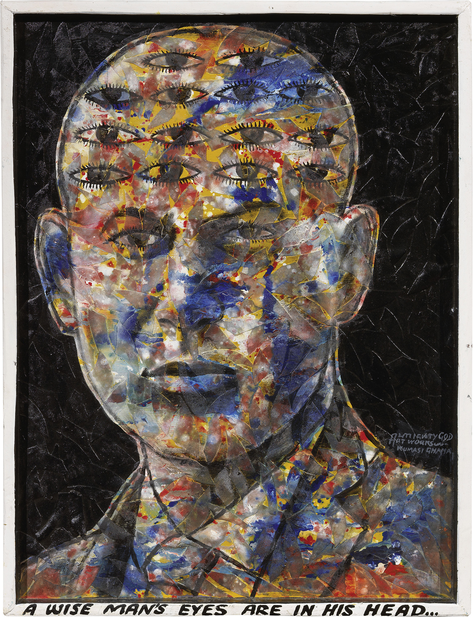 Almighty God (Antony Kwame Akoto), Kumasi 1950, A Wise Man's Eyes Are in His Head..., Tecnica mista su tavola, cm. 81x61, Firma e luogo in basso a destra: Almighty God / Art Works [...] / Kumasi Ghana, titolo in basso al centro: A Wise Man's Eyes Are in His Head...