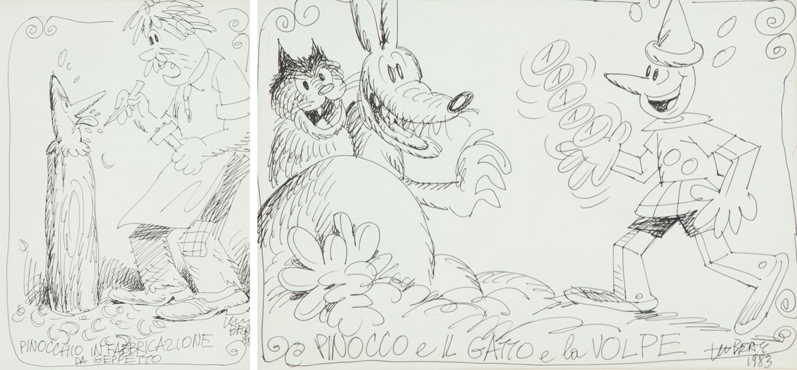 Vinicio Berti Lotto unico di due Opere - "Pinocchio in fabbricazione da Geppetto", 1983, China su carta, cm. 32x22, firma e data in basso a destra; - "Pinocchio e il gatto e la volpe", 1983, China su carta, cm. 22x32, firma e data in basso a destra.