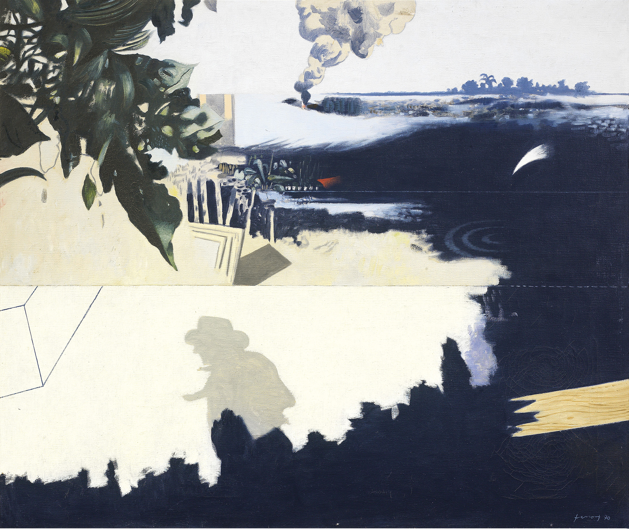 Gianfranco Ferroni, Livorno 1927 - Bergamo 2001, Racconto del lago, 1970, Olio su tela, cm. 110x130,5, Firma e data in basso a destra: Ferroni 70; titolo, data e firma al verso sulla tela: Racconto del lago / 1970 / Ferroni / n. 176 F.R.; sul telaio: etichetta Galleria Mutina, Modena, con n. 2291., Foto autenticata dall'artista, Forte dei Marmi, 27-08-99.