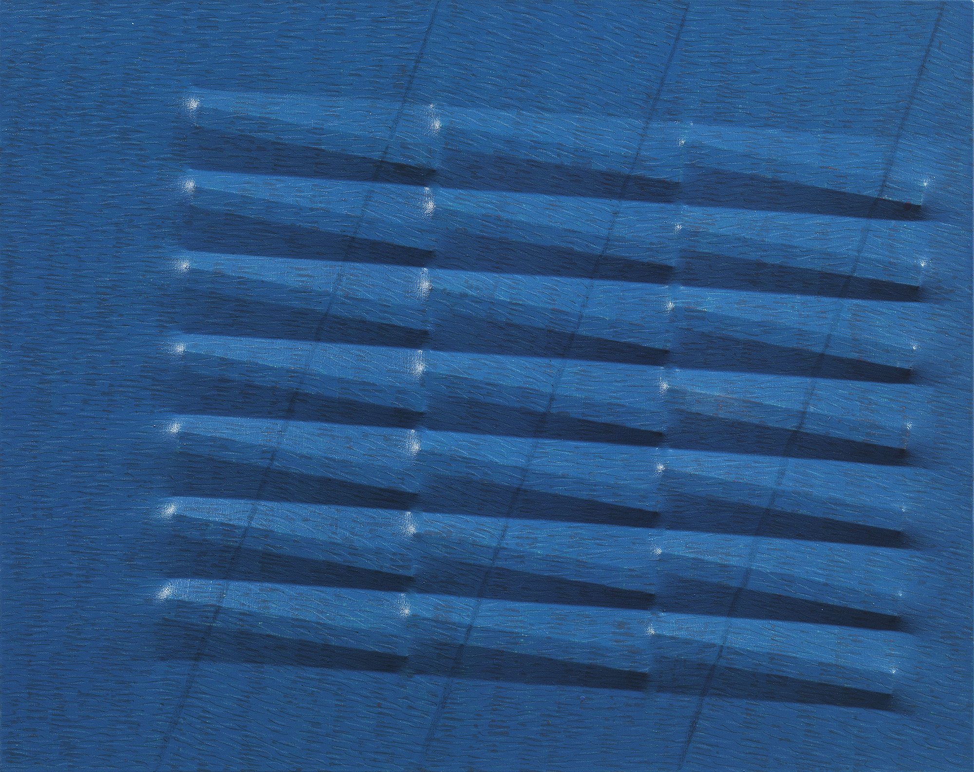 Agostino Bonalumi, Vimercate (Mi) 1935 - Milano 2013, Blu, 1987, Tela estroflessa, pastelli e vinavil, cm. 73x92, Firma e data al verso sulla tela: Bonalumi 87; sulla tela e sul telaio: n. 1063; sul telaio: timbro e etichetta con n. 3242 Lattuada Studio, Milano., Foto autenticata dall'artista in data 87, su certificato Archivio Bonalumi, Milano, con n. 87-067., Bibliografia: Agostino Bonalumi. Catalogo ragionato, a cura di Fabrizio Bonalumi e Marco Meneguzzo, Skira Editore, Milano, 2015, p. 590, n. 1162.