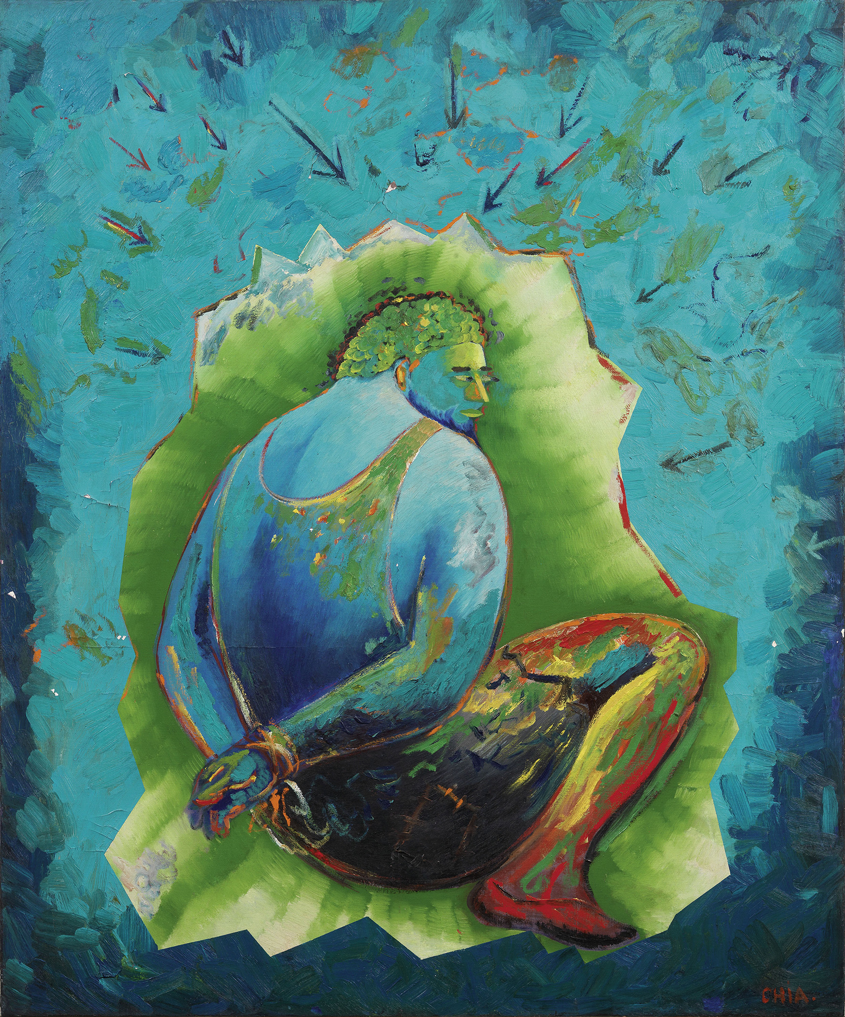 Sandro Chia, Firenze 1946, Lo schiavo, (1980), Olio su tela, cm. 180x150, Firma in basso a destra: Chia. Al verso sul telaio: etichetta Stedelijk Museum Amsterdam: etichetta Kestner-Gesellschaft Hannover / Ausstellung 9.12.1983 - 12.2.1984 / Katalog nr. 27: etichetta Gian Enzo Sperone, Roma., Storia: Collezione privata, Arezzo; Collezione privata, Esposizioni: Chia. Bilder 1976-1983, Hannover, Kestner-Gesellschaft, 9 dicembre 1983 - 29 gennaio 1984, cat. pp. 78, 79, 156, n. 27, illustrato a colori.
