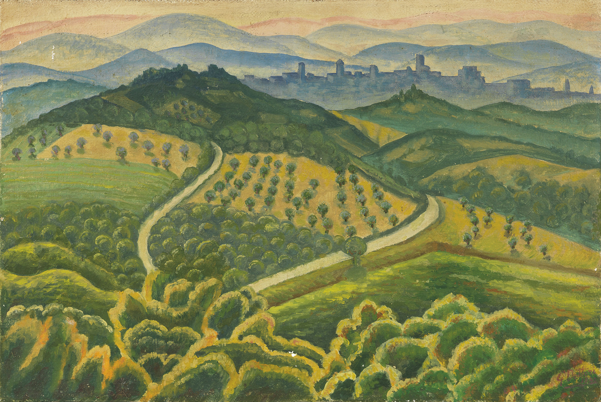 Gerardo Dottori, Perugia 1884 - 1977, Paesaggio da Monte Malbe (prima versione), 1942, Olio su tela di juta, cm. 40,5x59,5, , Firma e data in basso a destra: G. Dottori / 1942., , Certificato su foto di Massimo Duranti, Archivi Gerardo Dottori, Perugia, 3/2/2021, con n. 2405.