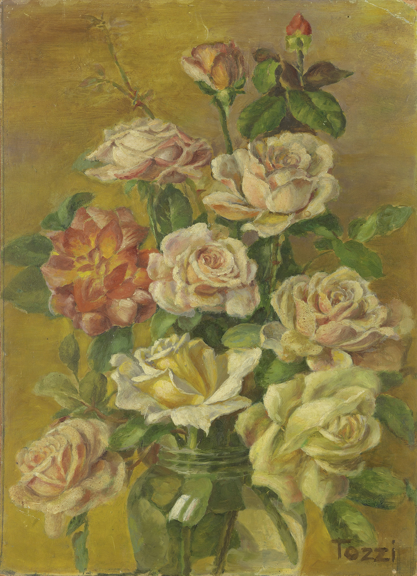 Mario Tozzi, Fossombrone (PU) 1895 - St. Jean du Gard 1979, Rose, (1919), Olio su faesite, cm. 31,2x22,7, , Firma in basso a destra: Tozzi., , Certificato con foto Archivio Tozzi, Foiano, 27 febbraio 2003, con n. 1992 (opera datata 1919).