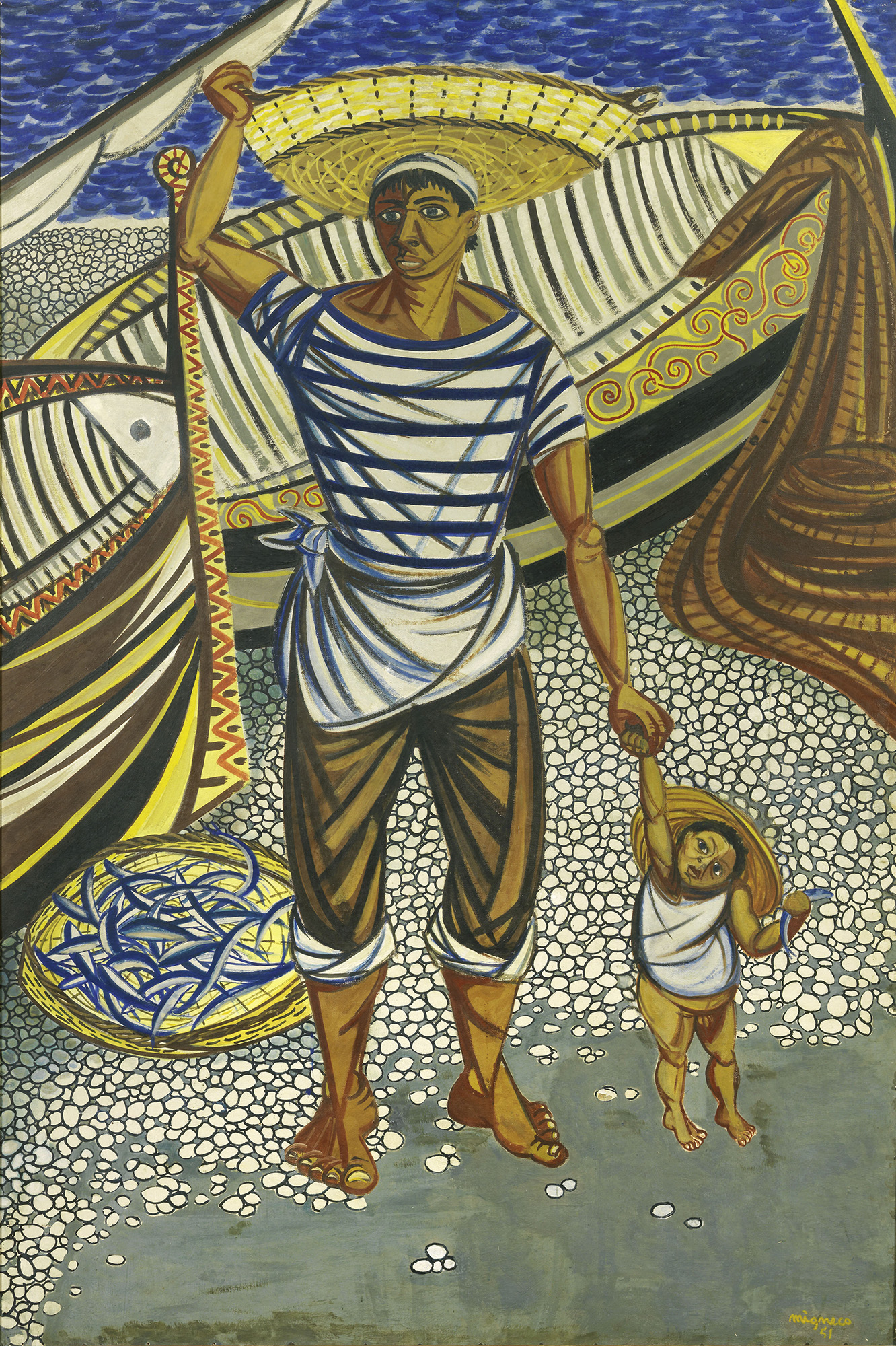 Giuseppe Migneco, Messina 1908 - Milano 1997, Pescatore, 1951, Olio su faesite, cm. 240x160, , Firma e data in basso a destra: Migneco / 51., , Storia, Opera acquistata direttamente dall'artista dall'attuale proprietario