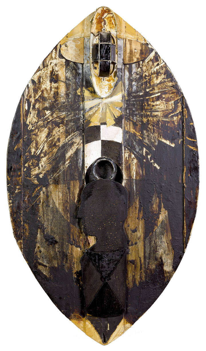 140x80 collage polimaterico su tavola con inserti in metallo e legno