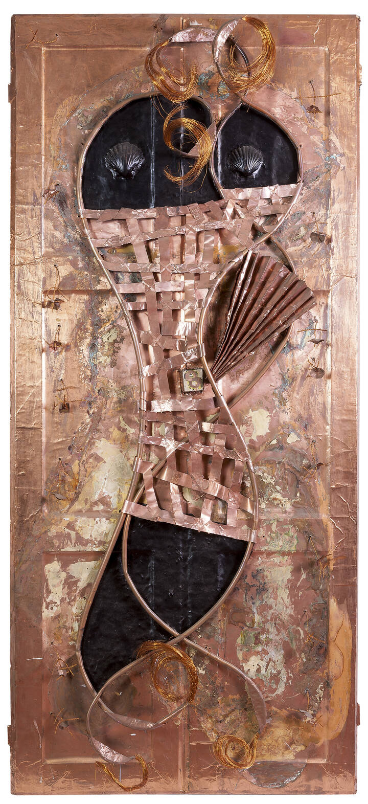 186,5x86 collage polimaterico su legno (due porte) con applicazioni in rame e conchiglie