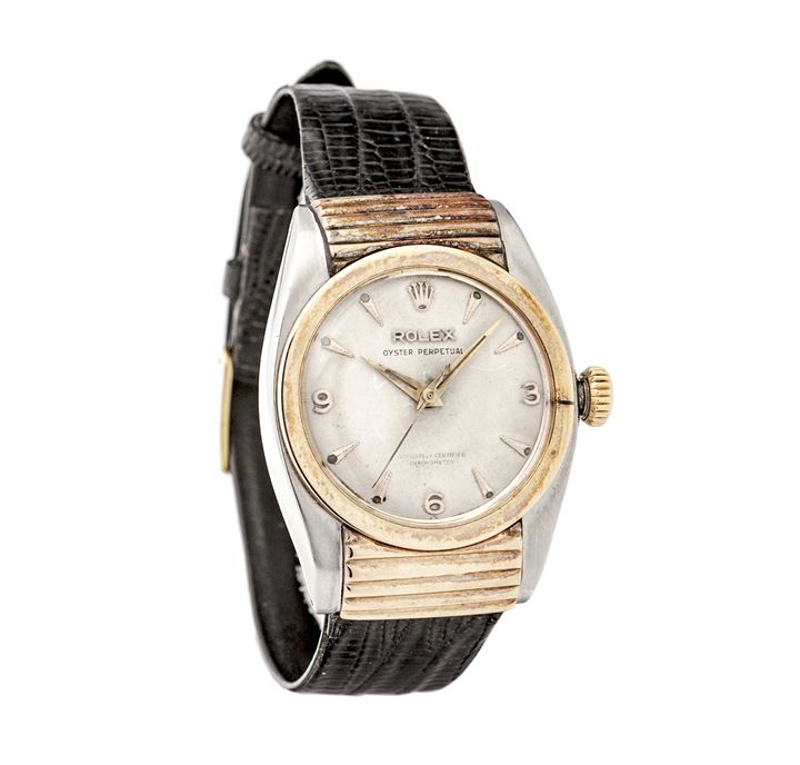 Cassa Oyster in acciaio e oro rosa, in tre parti, con fondo e corona a vite, particolari anse coperte dette "caché". Quadrante con indici applicati. Fondello danneggiato con riparazioni e saldatura, seriale illeggibile, canotto di carica rotto