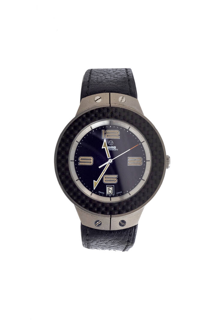 Cassa in titanio con lunetta in carbonio. Quadrante nero con numeri arabi luminescenti ai quarti, indicazione centrale dei secondi continui ed indicazione della data ad ore 6.