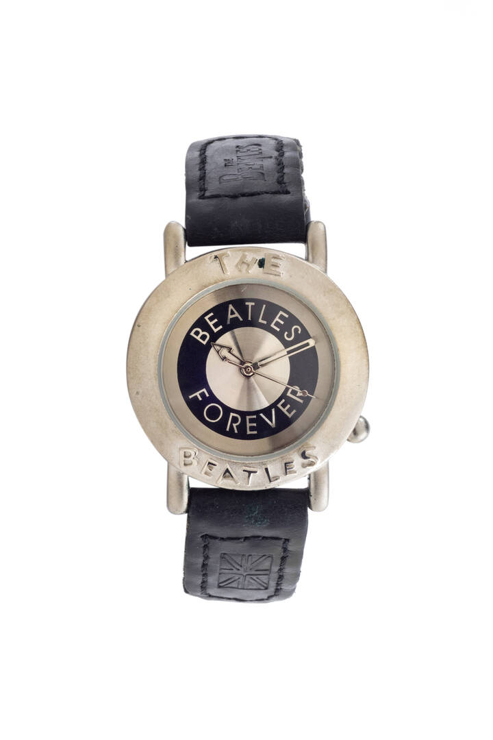 Cassa in metallo con fondello in acciaio. Quadrante argento recante la scritta “Beatles Forever”.