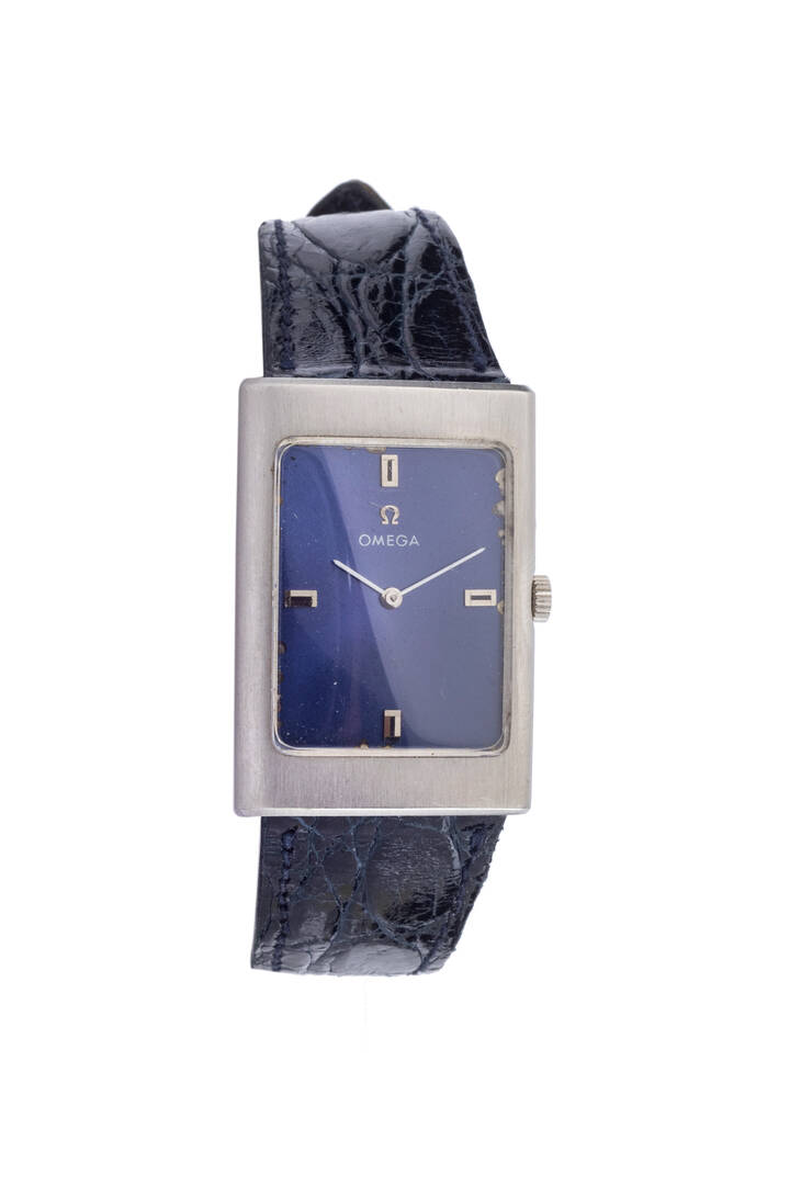 Cassa in acciaio, di forma, con fondello a pressione ed anse nascoste. Quadrante blu soleil con indici geometrici applicati ai quarti.