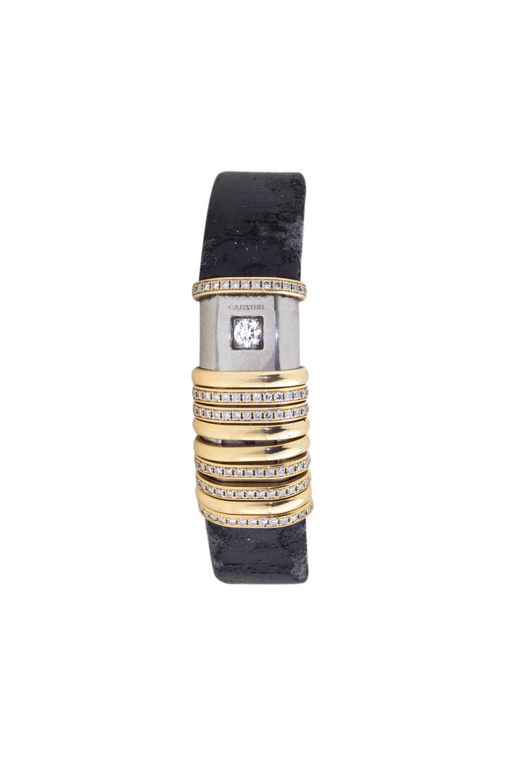 Cassa in titanio ed oro, di forma e curva adornata con diamanti anelli mobili impreziositi da diamanti taglio brillante che coprono un dimaante centrale Quadrante argento con lavorazione “fiorentino” e lancette blu. Chiusura clasp in oro e diamanti.